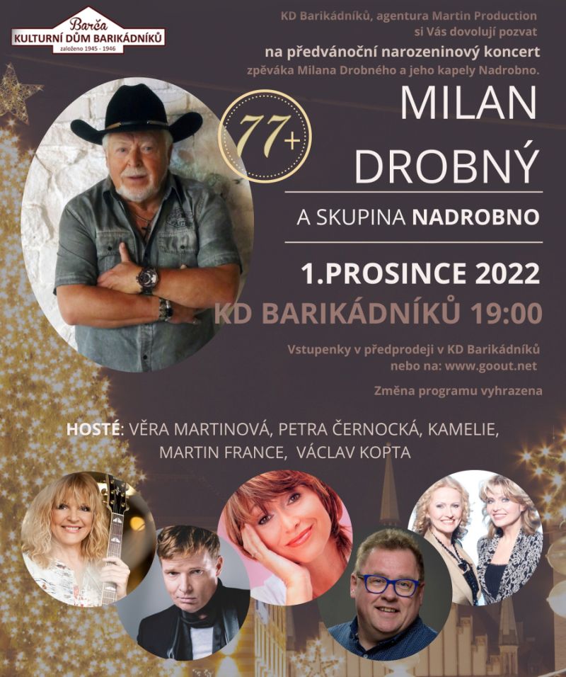Legenda ještě československé populární hudby Milan Drobný se rozhodl oslavit své 77 + narozeniny se svými přáteli v KD Barikádníků na Praze 10. Půlkulatým narozeninovým koncertem měl slavit už téměř před 3 lety, ale covid tomu tak nechtěl a hlavně je slaví až 8. prosince, kdy mu už bude opravdu 78 let. Ale v první prosincový den mu bude opravdu stále ještě propagovaných 77 +.