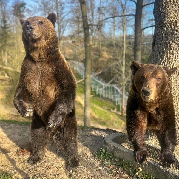 Největším labužníkem a jedlíkem táborské zoologické zahrady je medvěd hnědý John, který je zároveň i hlavou celé medvědí skupiny. Kromě něj ji tvoří ještě Max a Bubík. Obývají jeden z největších výběhů v pro medvědy v celé střední Evropě. Tvoří ho velkorysá rokle, na jejímž nejnižším místě je jezírko. Součástí přírodního výběhu jsou i vzrostlé stromy, které medvědům slouží ke šplhání. Největším mistrem v tom je nejmenší a nejsvětlejší Bubík, kterého nejčastěji můžete spatřit právě vysoko v korunách stromů, ve kterých dokáže strávit opravdu velmi dlouhé chvíle. Někdy k jeho vlastní škodě, protože často dorazí na pravidelné krmení poslední. Přesně proto chybí také na fotce ošetřovatelky Niny Martvoňové, které krásně pózují jen dva z medvědí trojice – John a Max. Možná budete mít větší štěstí než ona a o prodlouženém velikonočním víkendu se vám podaří na jednu fotku dostat všechny tři táborské medvědy naráz. Největší šanci budete mít při pravidelné komentovaném krmení, při kterém budete mít medvědy takřka na dosah ruky.