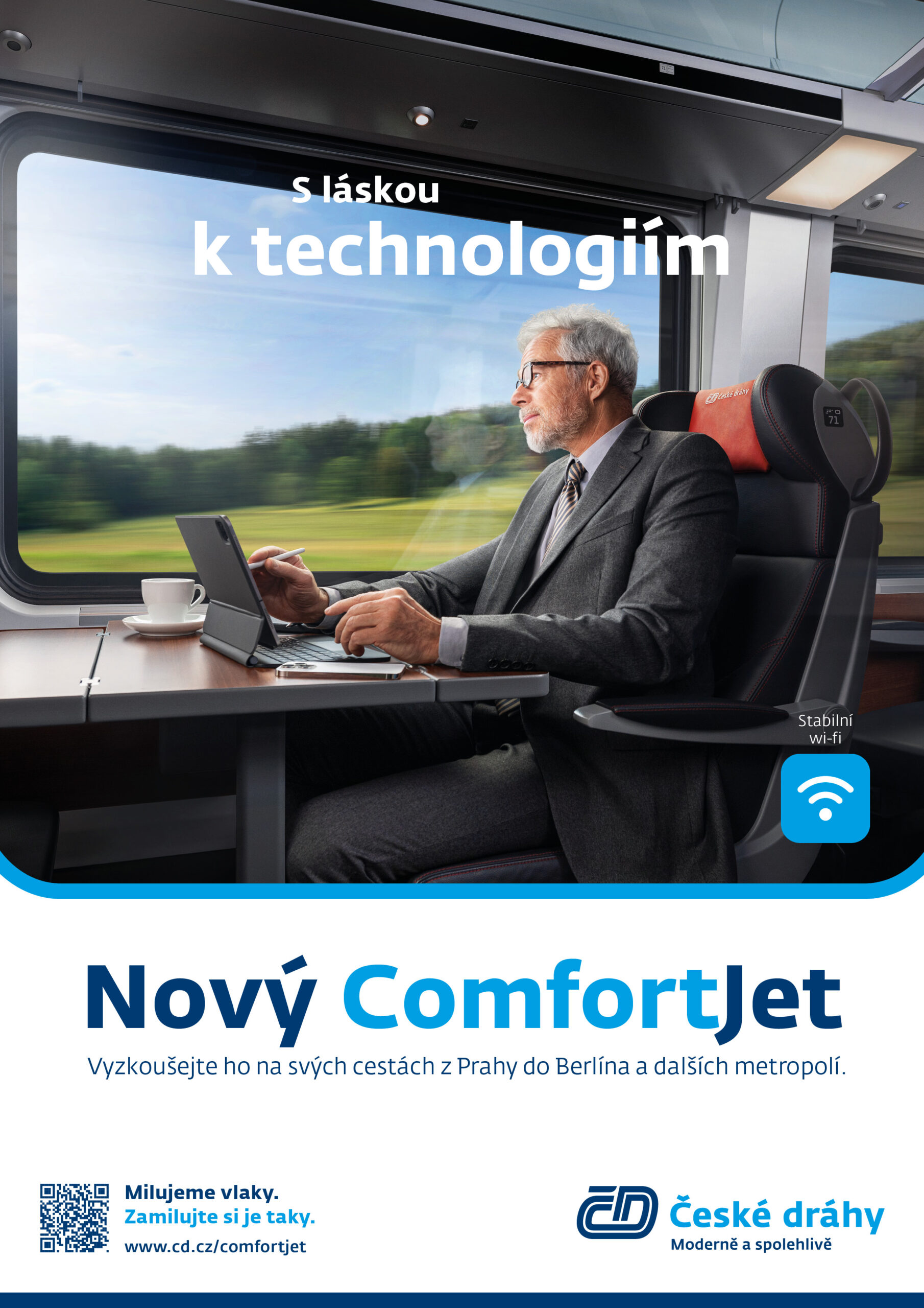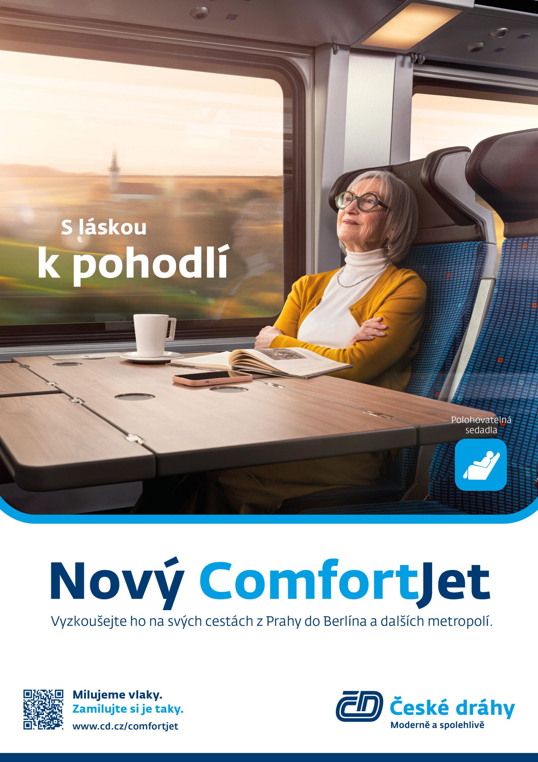Nejmodernější vlakové soupravy Českých drah ComfortJet nabízejí bezkonkurenční pohodlí pro každou cestu. Díky polohovatelným sedadlům, oknům propouštějícím mobilní signál, Wi-Fi nebo třeba dětskému kinu pocítí cestující v nových vlacích s maximální rychlostí 230 km/h na tuzemských kolejích doposud nepoznaný komfort. ČD budou do konce letošního roku provozovat celkem 14 z celkových 20 objednaných souprav ComfortJet.