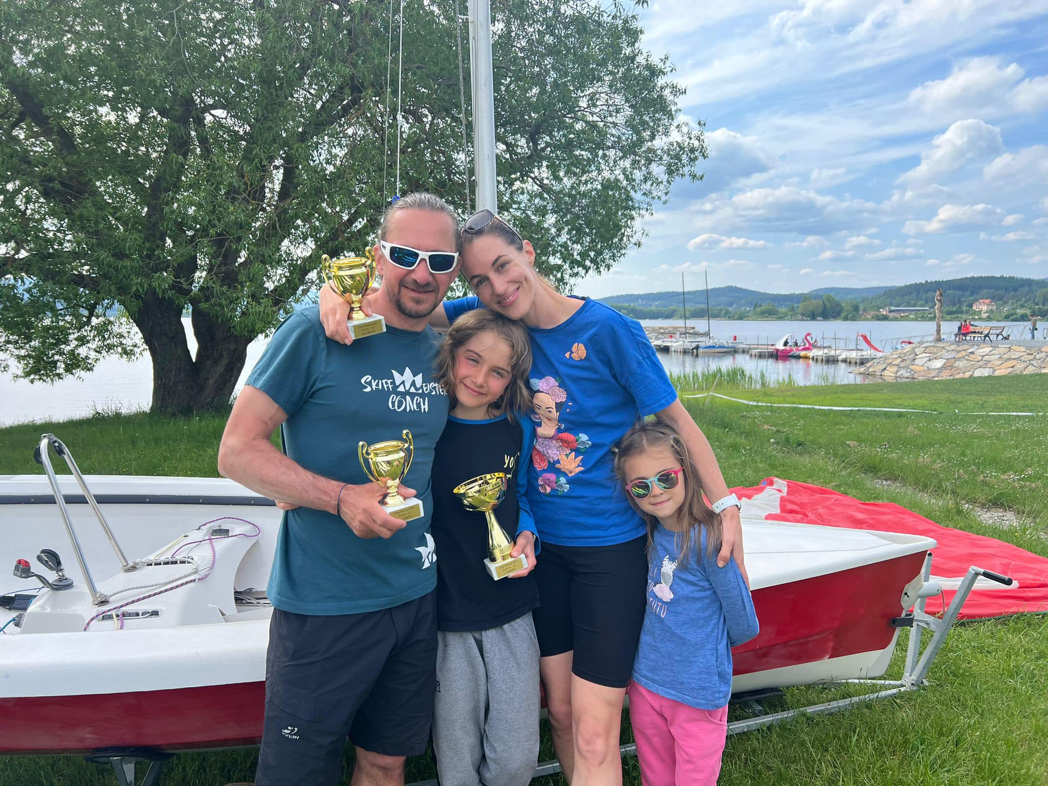 A právě v poslední jmenované třídě byli mezi startujícími posádkami i David Křížek s manželkou Lucií. Závodili spolu vůbec poprvé a hned si odvážejí bronz. „Před závodem jsme trénovali jen asi 10 minut. Převrátili jsme se, roztrhli plachtu a Lucie si i zaplavala. Nestihli jsme start. Ve druhé rozjížďce jsme měli kvůli snaze zabránit kolizi, předčasný start. Nebyl to dobrý vstup do závodu, ale pak už jsme si to jen užívali. Největší dík patří mé nejstatečnější manželce, snad se jí zlomený nehet a modřiny brzo zahojí,“ popisoval David Křížek, pyšný na svého syna, který bral zlato ve třídě RS Feva.