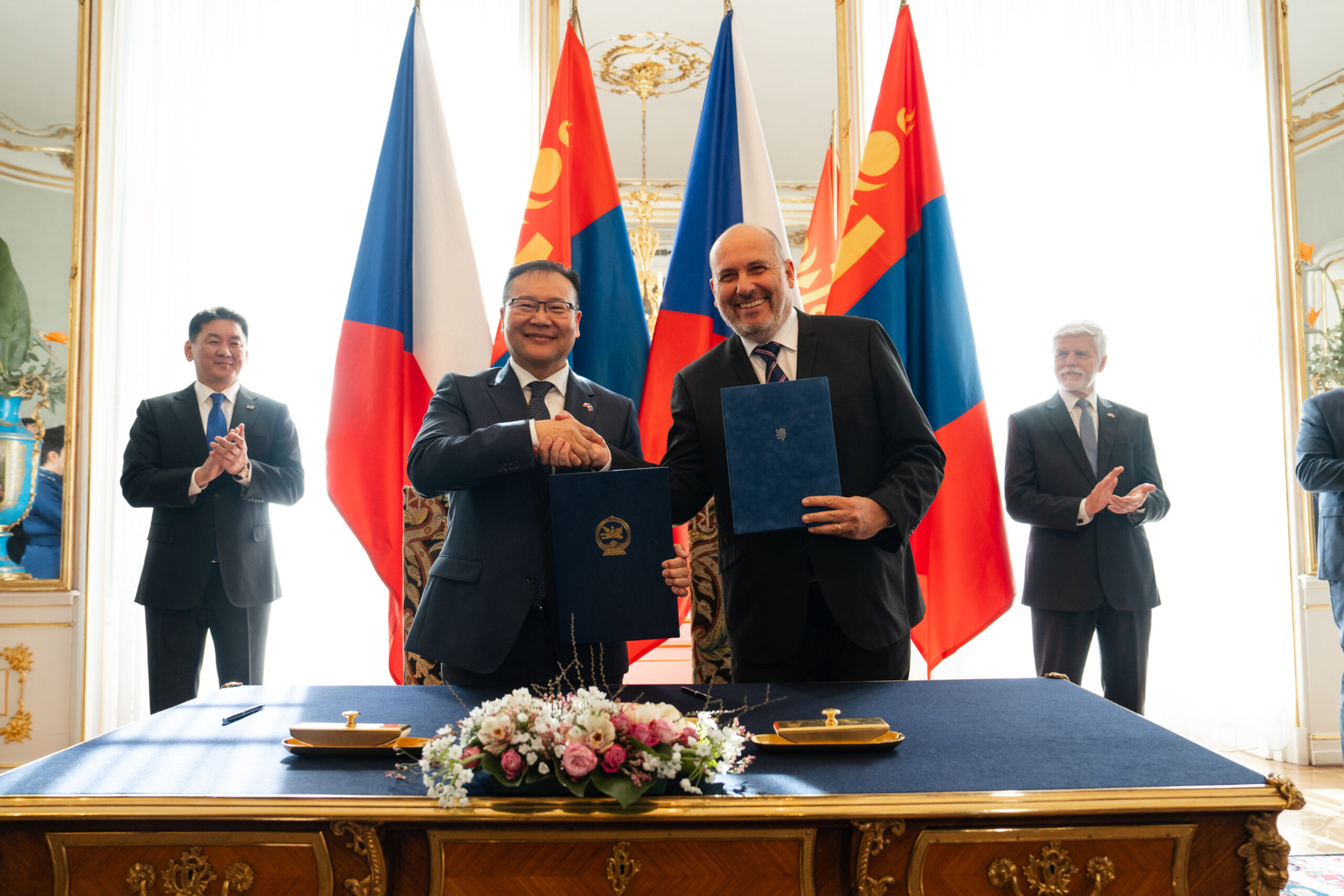 Foto 4: Podpis memoranda mezi Zoo Praha a Ministerstvem pro životní prostředí a klimatickou změnu Mongolska, které mimo jiné jmenuje Zoo Praha jako hlavního partnera pro ochranu velbloudů divokých. Na snímku z Pražského hradu je uprostřed ředitel Zoo Praha Miroslav Bobek a Jeho Excelence velvyslanec Mongolské republiky v ČR Damdin Gansukh. Po stranách stojí prezident Mongolské republiky Uchnágín Chürelsüch a prezident ČR Petr Pavel. Zdroj: Kancelář prezidenta republiky, Foto Tomáš Fongus