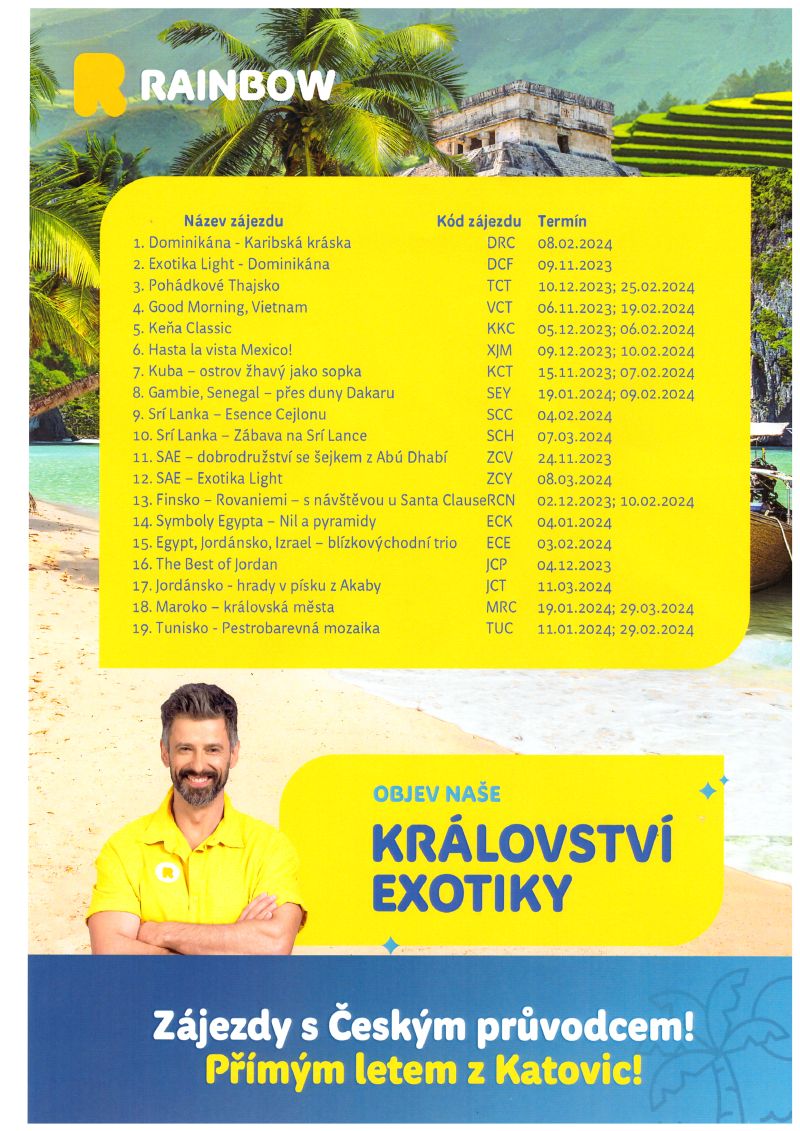 Od roku 2015 jsme generálními představiteli polské cestovní kanceláře Rainbow pro Českou a Slovenskou republiku. Díky tomu jsme schopni našim klientům nabídnout kvalitní zájezdy do celého světa za skvělých podmínek. Příprava a realizace každého zájezdu je pro nás individuální záležitostí, která nás baví. Našim klientům poskytujeme pravdivé informace, založené na dlouholetých zkušenostech našeho týmu a spolehlivou znalosti toho, co nabízíme. Naše vlastní nabídka není příliš široká, vždy než přidáme novou destinaci, musíme ji nejdříve důkladně osobně poznat. To však neznamená, že si u nás nevybere každý, i ten nejnáročnější zákazních. V tom se právě můžeme spolehnout na našeho polského partnera. Naším mottem je: nejde nám o to být především největší, naším cílem je být nejlepší…