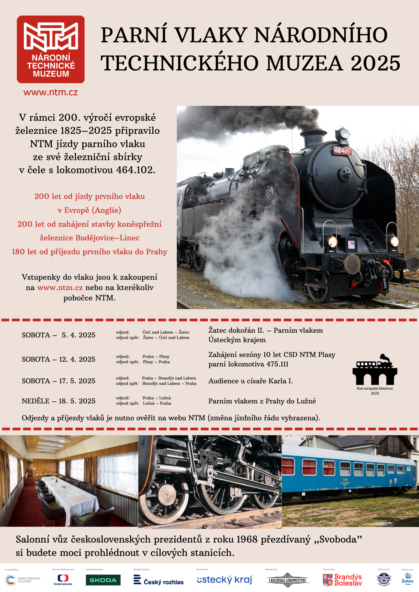 „Letos si připomínáme velká železniční výročí. V roce 1825 byla v Anglii mezi městy Stockton a Darlington otevřena první veřejná železniční trať s parním provozem na světě, slavnostním výkopem byla ve stejném roce zahájena stavba koněspřežné železnice na trase z Českých Budějovic do Lince – první veřejná železnice u nás, před 180 lety přijel do Prahy na dnešní Masarykovo nádraží první parní vlak. Oslavit tato výročí chceme společně s veřejností. První akcí, na kterou bych rád pozval, je cesta muzejním vlakem v čele s parní lokomotivou 464.102 Ústeckým krajem na zahájení turistické sezóny do města chmele – Žatce. Neméně významnou jízdou historického vlaku Národního technického muzea bude jízda z Prahy přes Plzeň do Plas v čele s lokomotivami 475.111 a 478.1010 na zahájení výroční 10. sezóny Centra stavitelského dědictví NTM,“ uvedl generální ředitel NTM Karel Ksandr.