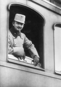 Poslední císař a král Karel I. v okně historického vagonu, kterých se nachází ve sbírkách NTM.