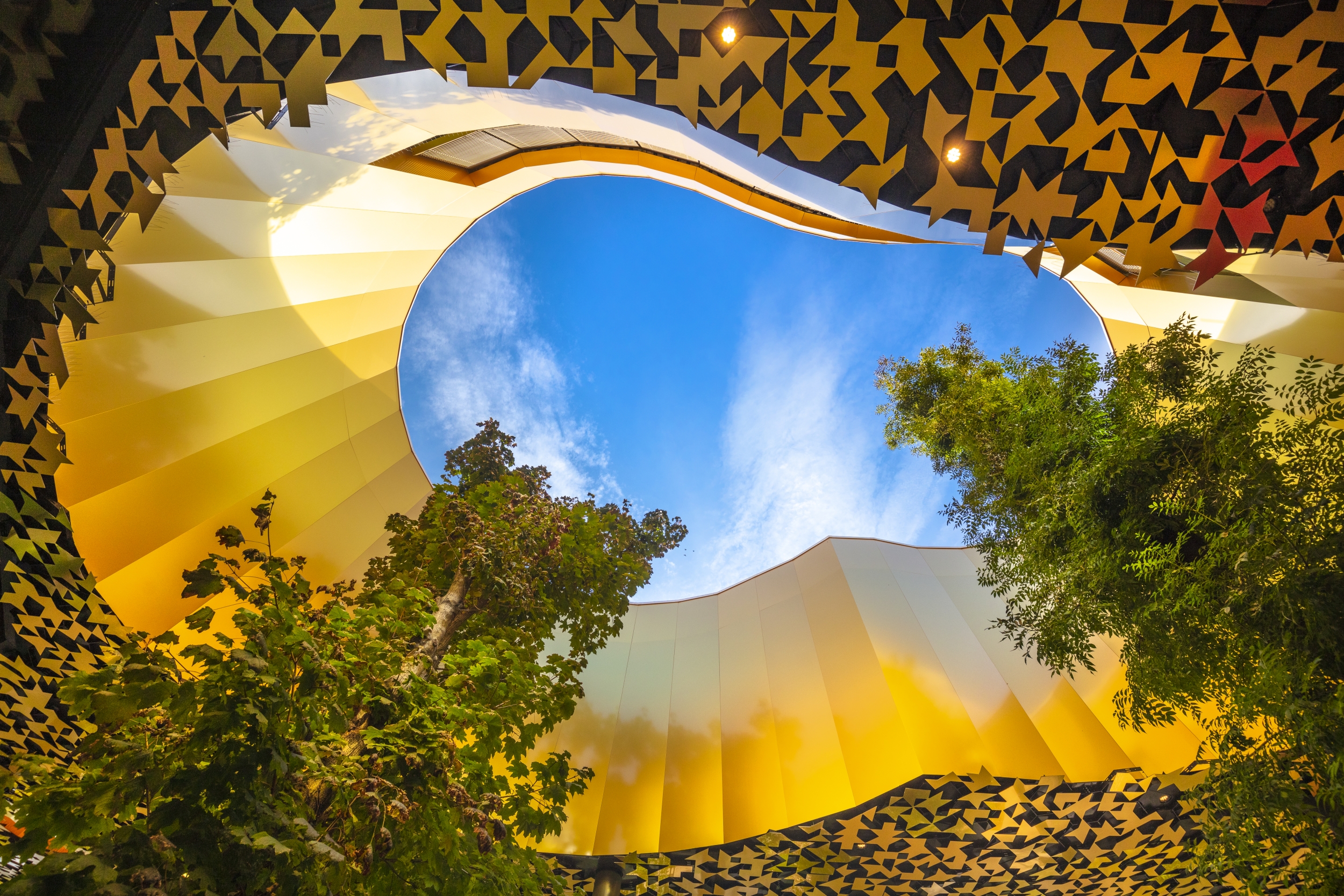 Velkolepou dominantou budovy je skleněná opona obklopující upravenou střešní zahradu na vrcholu dvou vzhůru zahnutých křídel. Tento prvek pokrývá rastrovaná kovová mřížka s etnografickými motivy vybranými z maďarských a mezinárodních sbírek muzea, která se skládá z téměř půl milionu pixelů, jež byly laserem vyryty speciálním robotem do hliníkových mřížek připevněných k budově.