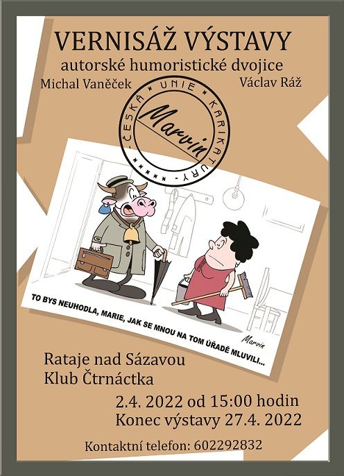 Začínáme 16. sezonu výstav kresleného humoru. Jako první se nám představí veselá dvojice Michal Vaněček s Václavem Rážem. Kreslíř – ilustrátor a spisovatel. Nebo obráceně? Na to, jak to vlastně je, se jich můžeme zeptat již za týden, v sobotu, 2. dubna ve 3 odpoledne. Jen na úvod: Michal Vaněček, původem hodně úspěšný IT. Tedy bez zkratek – Ajťák. Napsal několik knížek – hlavně pro děti. No několik: zaplnily by vám třeba půl regálu v knihovně… Koncem desátých let tohoto tisíciletí se dal umělecky dohromady s kreslířem Václavem Rážem. Vzájemně se inspirují ve své tvorbě a výsledkem toho je duo Marvin.
