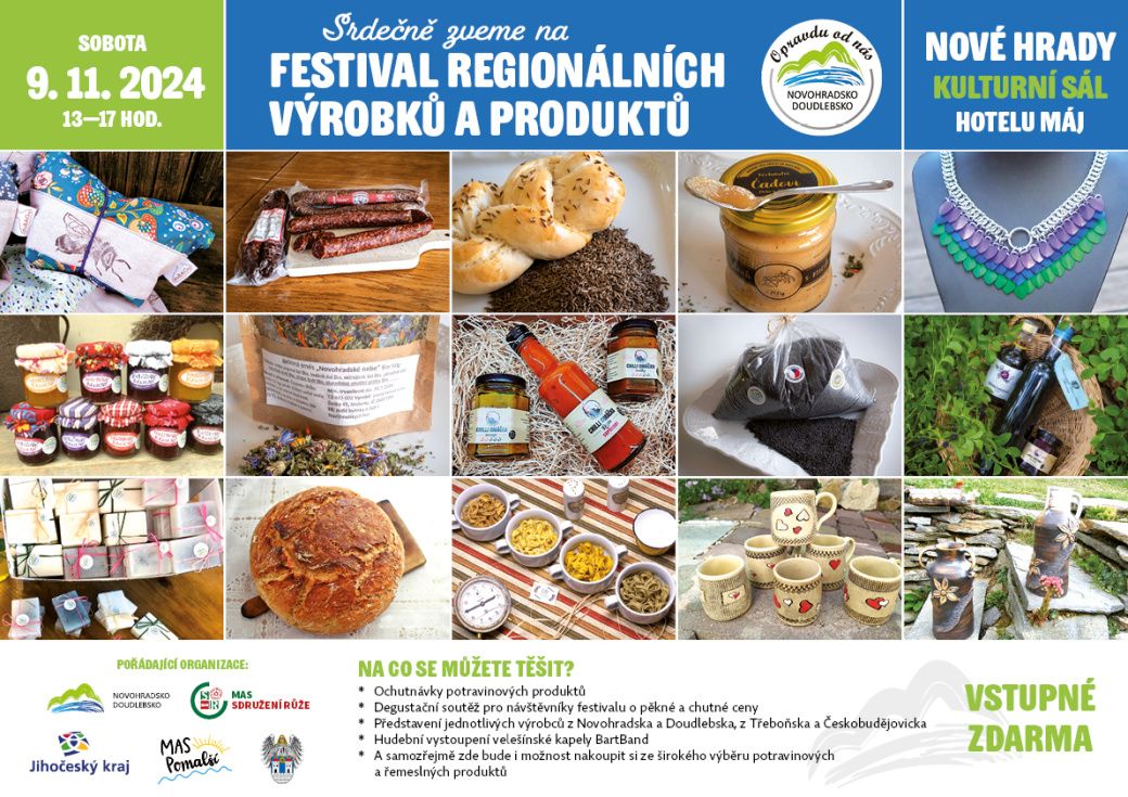 Kulturní sál hotelu Máj v Nových Hradech bude v sobotu od 13 do 17 hodin hostit již třetí ročník Festivalu regionálních produktů. Své výrobky tam nabídnou regionální producenti a řemeslníci, připravené budou ochutnávky, soutěže nebo také hudební vystoupení skupiny BartBand.