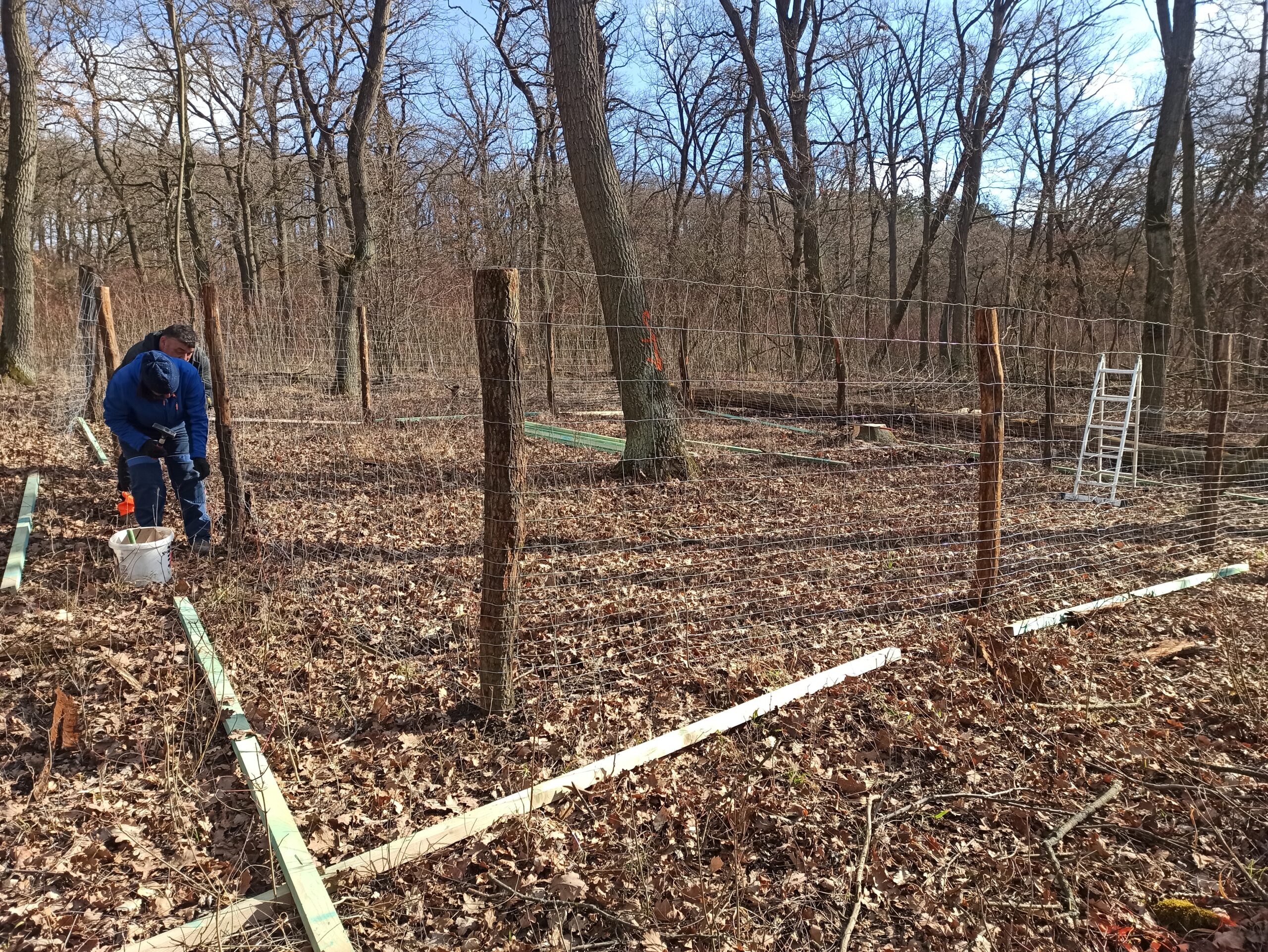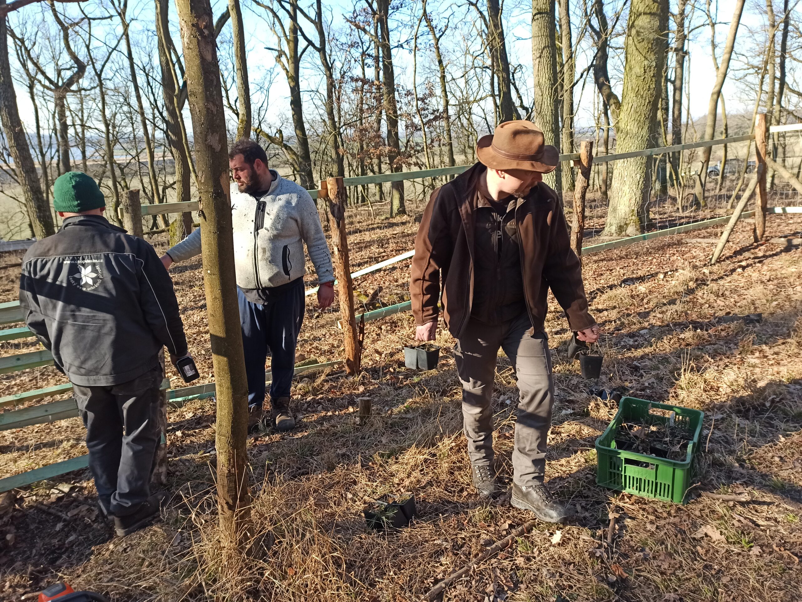 Žehuňsko, Hradčany (Nymbursko) 9.4. 2025: Zhruba 1500 vzácných dubů pýřitých (Quercus pubescens), zvaných též „šípák“, sází ochránci přírody z ČSOP Vlašim v národní přírodní rezervaci Kněžičky u Žehuně. Sazenice se v rámci projektu LIFE SouthMoravia vysazují na ploše 15 hektarů do oplocenek 10 x 10 metrů.