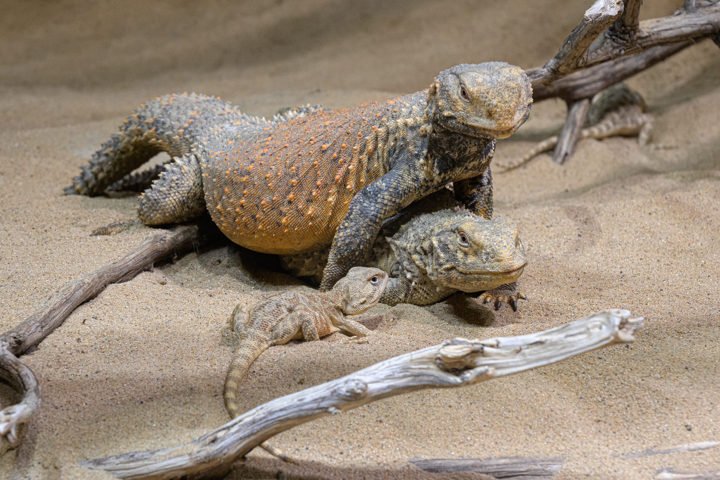 Foto 3: Páření trnorepů mezopotámských – jedněch z nejvzácnějších ještěrů v Zoo Praha – lze během těchto týdnů pozorovat v expozici Kattakum v Pavilonu šelem a plazů. Námluvy spojené s poskakováním samců či boji o samičky se v tomto teráriu týkají i jeho ostatních obyvatel, např. agam stepních (též na snímku). Foto Petr Hamerník, Zoo Praha