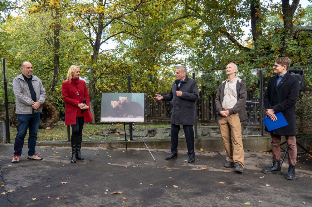 Foto 1: Slavnostní odhalení jmen psů pralesních proběhlo v pravé poledne v areálu malých amerických šelem za účasti ředitele Zoo Praha Miroslava Bobka i vzácných hostů z Magistrátu hl. m. Prahy. Zleva: Ředitel Zoo Praha Miroslav Bobek, náměstkyně primátora hl. m. Prahy pro oblast životního prostředí Jana Komrsková, primátor hl. m. Prahy Bohuslav Svoboda, kurátor savců Pavel Brandl a tiskový mluvčí Zoo Praha Filip Mašek. Foto Oliver Le Que, Zoo Praha