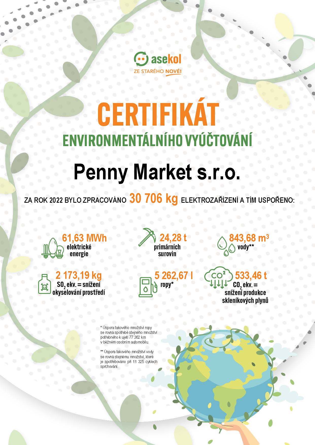 Společnost PENNY předala kolektivnímu systému ASEKOL v roce 2022 k recyklaci celkem 30 706 kg elektroodpadu. Díky tomu se podařilo uspořit 61,63 MWh elektřiny, 5 262,67 litrů ropy, 843,68 m3 vody a 24,28 tun primárních surovin. Pro porovnání, v případě ropy se jedná o množství, z něhož by se vyrobil benzín, na který by běžný osobní automobil ujel 77 632 kilometrů, a v případě vody je to množství potřebné na běžné osprchování 11 325 lidí. Ušetřená energie znamená 3letou spotřebu 6 rodin žijících ve standardním bytě. Navíc PENNY snížilo emise skleníkových plynů o ekvivalent 533,46 tun CO2 a produkci SO2, který zapříčiňuje okyselování prostředí, o ekvivalent 2 173,19 kg.
