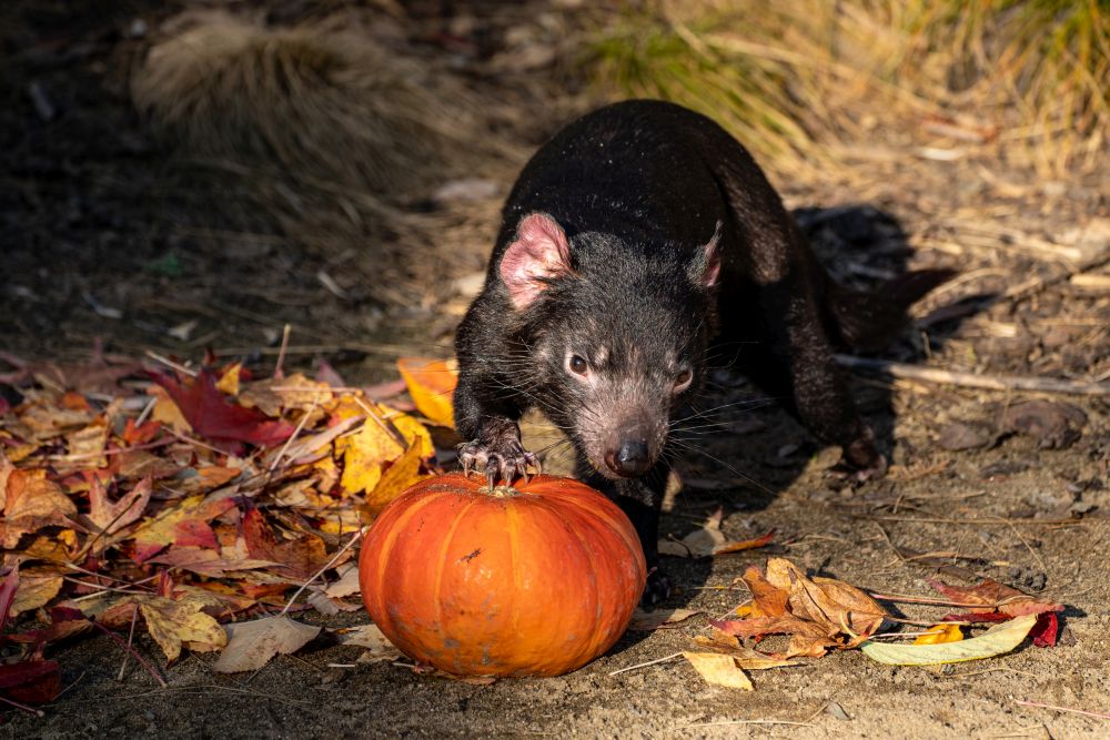 Foto 1: Dýňové hody se mezi návštěvníky Zoo Praha staly velmi oblíbenou akcí. Některá zvířata dýně zkonzumují, jiná si s nimi hrají, avšak vzbudit zájem masožravců – jako ďáblů medvědovitých – musí chovatelé poněkud jiným obsahem. Foto Oliver Le Que, Zoo Praha