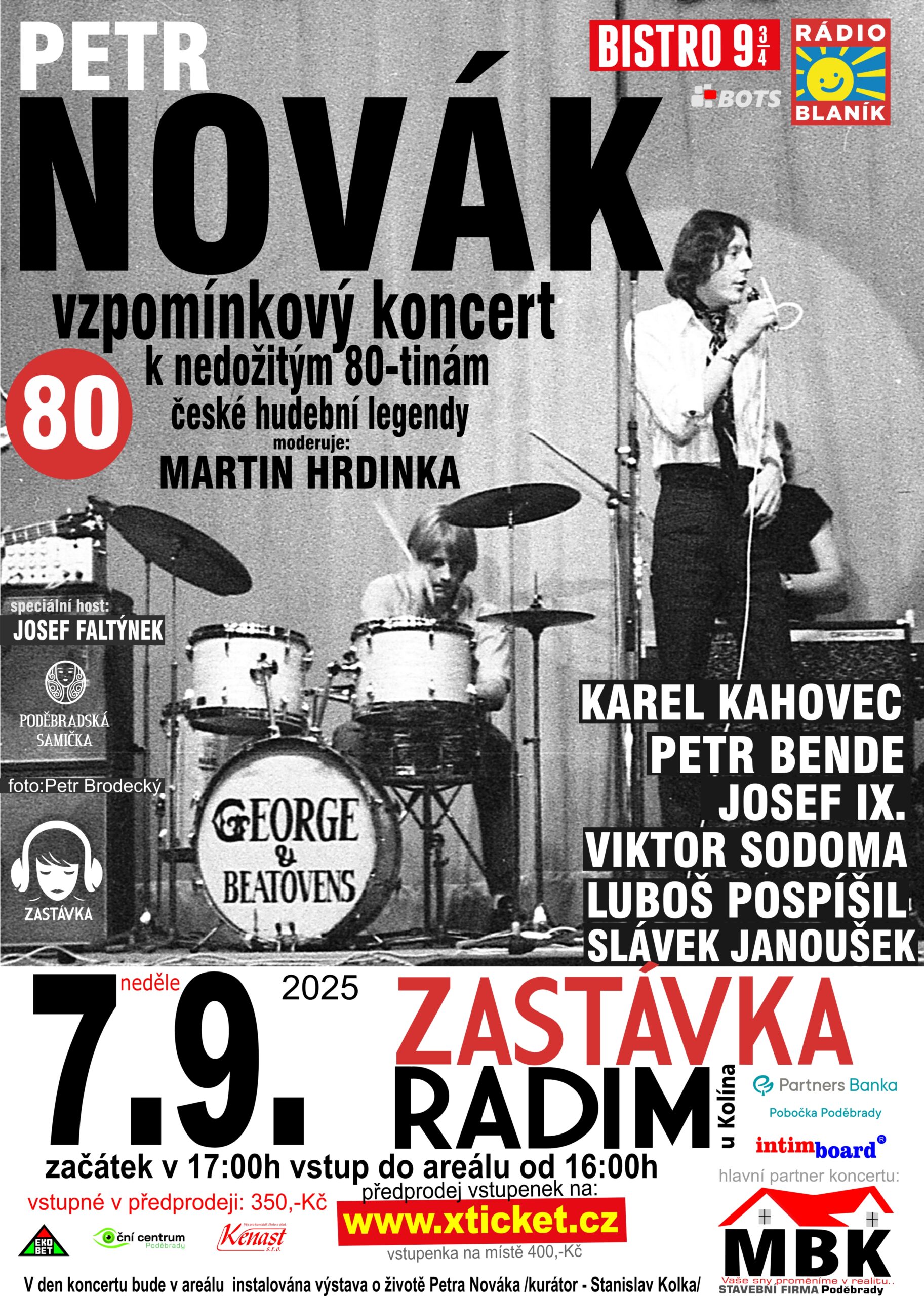 Koncert Petr Novák „80“ proběhne v neděli 7. září 2025 od 17:00 v areálu Zastávka Radim u Kolína (U Trati 94).