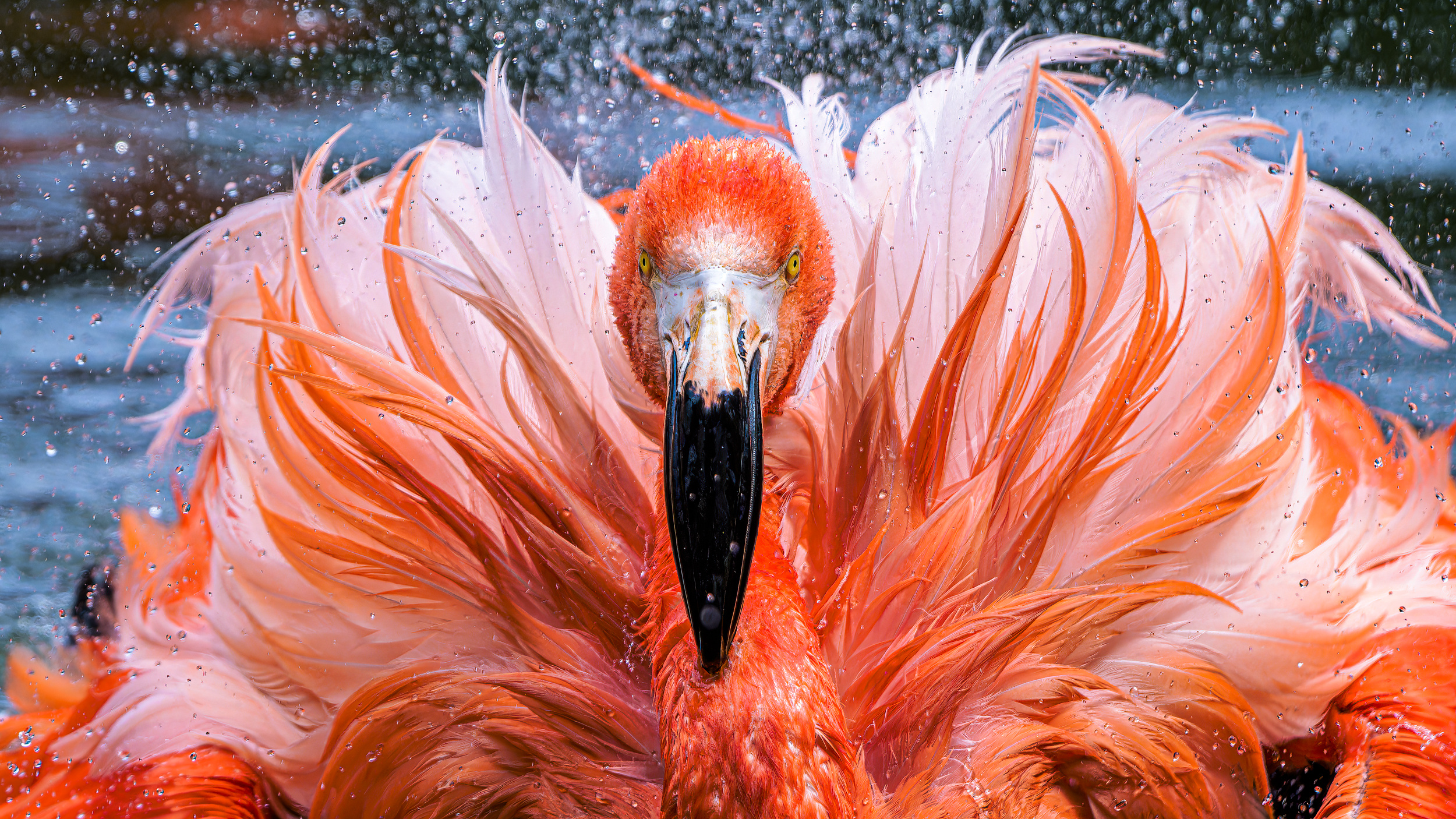 Foto 1: Plameňáci jsou vlajková zvířata nové kampaně Mokřady pro život. Na snímku je plameňák kubánský při koupeli. Foto Petr Hamerník, Zoo Praha