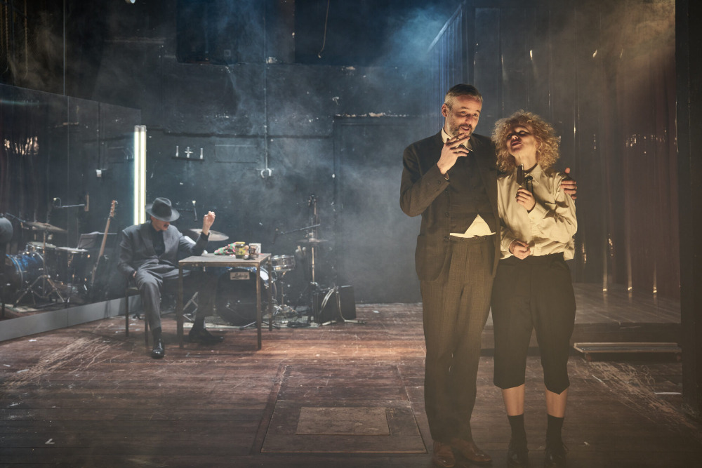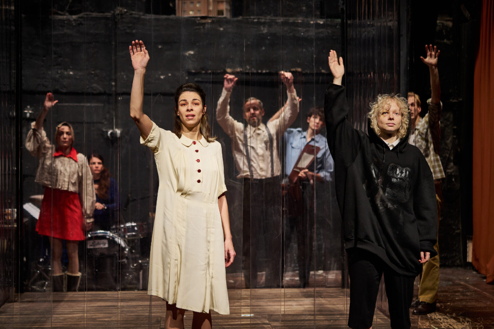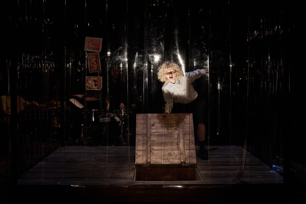 Zajímavě vyřešila scénu: Uprostřed scény stojí otočná krychlová kovová konstrukce, která má strany vyplněny závěsy z průhledných plastových pásů. Zdařile doplňují inscenaci filmové dotáčky, kostýmy jsou rovněž velmi povedené.