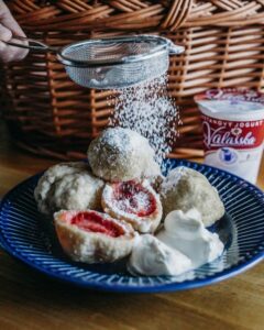 První recepty na ovocné knedlíky na českém území pochází už ze 17. století. Původně se knedlíky připravovaly smažením a až o něco později se začaly i vařit,“ uvádí Zuzana Pavelková, marketingová manažerka Mlékárny Valašské Meziříčí. „Sladké knedlíky můžeme kromě jahod plnit také švestkami, meruňkami či borůvkami, posypat mákem, skořicí, opraženou strouhankou a navrch pak dát šlehačku, jogurt či kysanou smetanu,“ dodává Zuzana Pavelková.