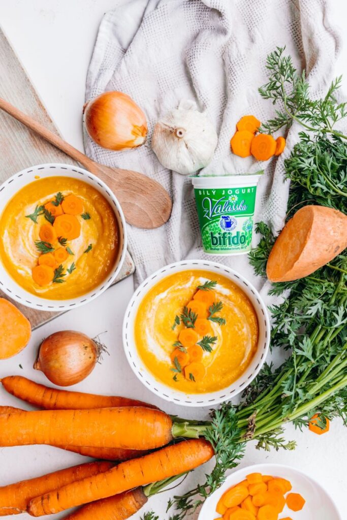 Denní rovnodenností jsme se rozloučili se sluncem a měli možnost poděkovat mu za vše dobré, co díky němu můžeme mít. Slunce pomalu odchází na naši druhou polokouli a nám tím dopřává čas sestupu do vlastního nitra, zklidnění se, možnost regenerace, uzdravení, znovuzrození a transformace. Ruku v ruce s tím jde i strava, která se s příchodem podzimu mění, nebo by se měla změnit. Důležité je v tomto přechodném období koření a bylinky pro zahřátí. Abychom tělo prohřáli a zároveň jej ochránili před nemocemi. V tomto období se nejvíce hodí například kari, kurkuma, pepř, paprika, rozmarýn, muškátový oříšek, hřebíček, skořice či zázvor. Jedná se jak o přírodní lék při nachlazení a virózách, tak výborné ingredience do nejrůznějších pokrmů. S jejich použitím docílíme velice lahodného a zdravého pokrmu. Některé druhy koření či bylin prokrví organismus a zahřejí ho už během několika minut po požití. Mlékárna Valašské Meziříčí, známá svými výrobky, ale rovněž podporou zdravého životního stylu přináší dva tipy na takovéto podzimní zahřívací dobroty. Jejich příprava netrvá dlouho, jejich pozitivní vliv na lidský organismus, ale dlouhodobé účinky rozhodně má. Prvním z nich je Mrkvovo-batátový krém s kurkumou a druhým Slaný dýňový koláč.