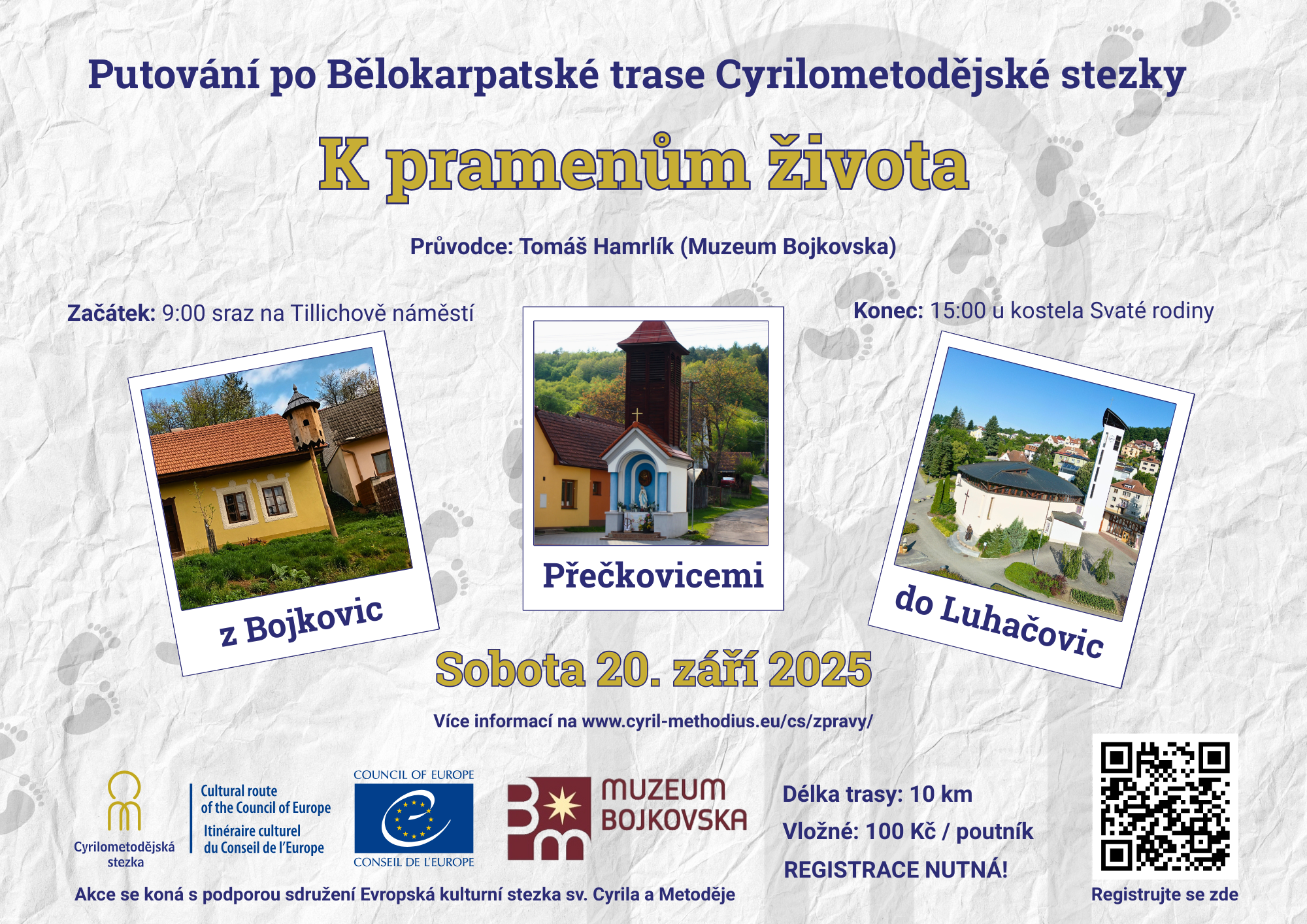 Třetí putování po stezce je naplánováno na sobotu 20.9. Uskuteční se na Bělokarpatské trase stezky mezi Bojkovicemi a Luhačovicemi. Kvalifikovanými průvodci budou Tomáš Hamrlík z Muzea Bojkovska a národní koordinátor CM stezky Petr Slinták. Průvodci účastníky seznámí s historií zdejších památek i šetrného obhospodařovaní krajiny bohaté na minerální prameny. Putování krajinou Luhačovského Zálesí bude zakončeno u pramene sv. Josefa před kostelem Svaté rodiny. Průvodce T. Hamrlík na putování též zve: