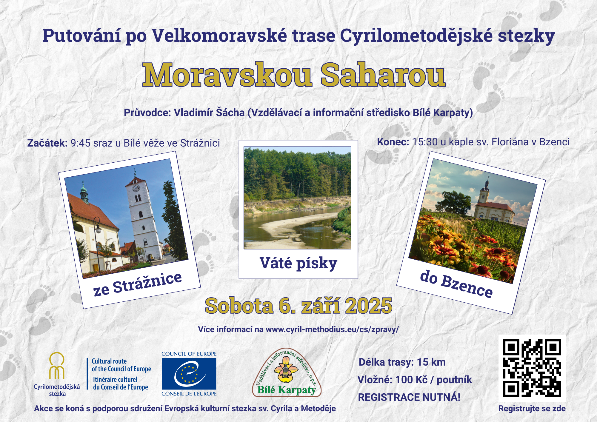 Další jednodenní putování po Cyrilometodějské stezce je naplánováno na sobotu 6.9. To se uskuteční na Velkomoravské trase stezky mezi Strážnicí a Bzencem. Zájemci budou kráčet nejen kolem památek v obou zmíněných městech, ale také rozsáhlou přírodní lokalitou Bzenecká Doubrava, kterou charakterizují borové lesy rostoucí na písčité půdě. Putování tzv. Moravskou Saharou svým výkladem doplní pedagog a průvodce Vladimír Šácha, který na putování osobně zve: