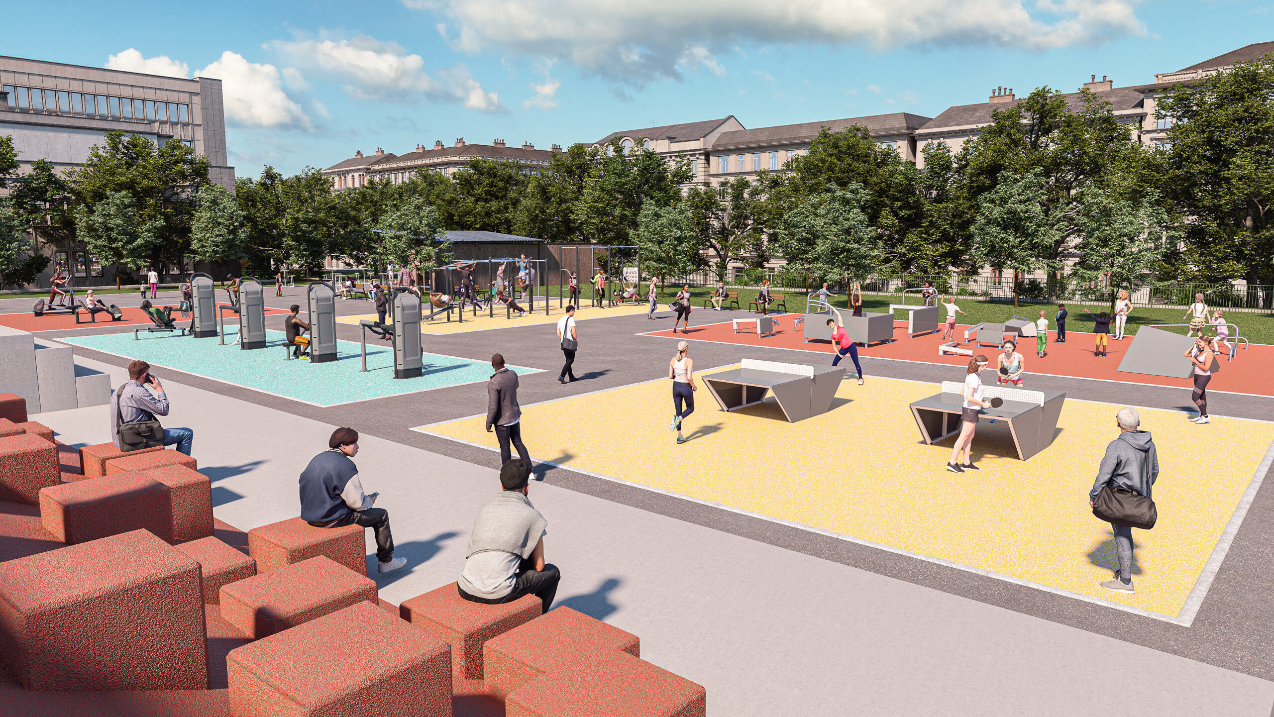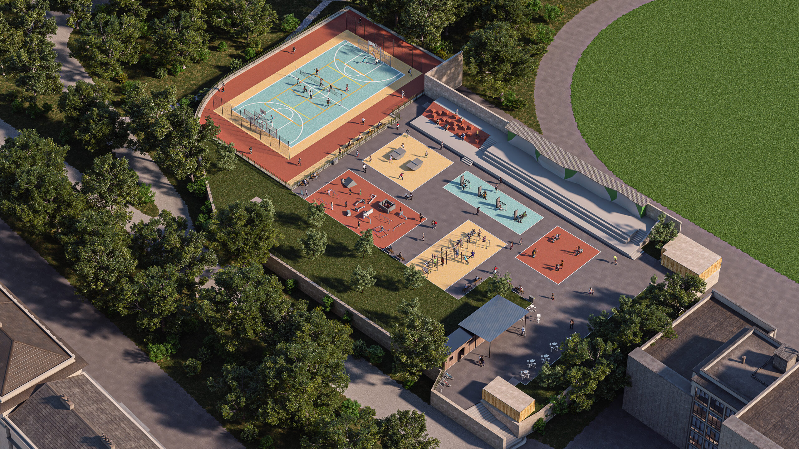 Projekt počítá s modernizací a rozšířením sportovních ploch a klade důraz na jejich víceúčelové využití. Areál nabídne prvky pro děti různých věkových kategorií, malé sportovní hřiště vhodné pro fotbal či basketbal a také menší fitness zónu, kterou ocení zejména rodiče. Vizuální podoba hřiště vychází z přírodních motivů – herní prvky budou inspirovány lesem, aby do městského prostředí vnesly co nejvíce přírody. Všechny navržené povrchy budou propustné.