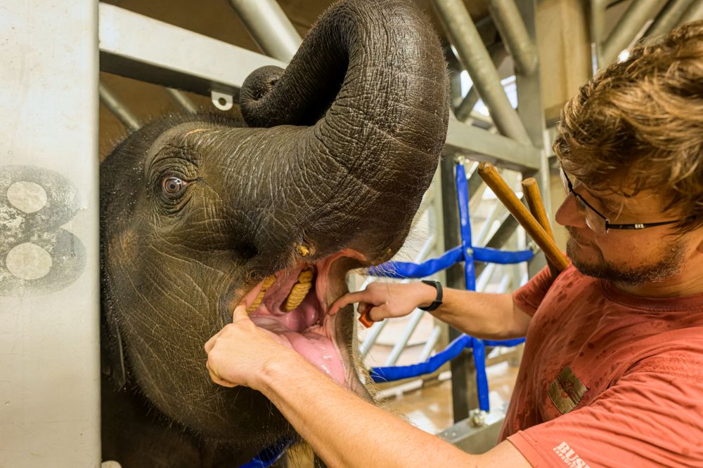 Pravidelný veterinární trénink je důležitý kvůli prevenci, kdy každodenní kontrolou můžeme odhalit potenciální zdravotní problém, navíc nacvičené veterinární úkony jsou pak pro zvířata pouhou rutinou, a nikoli stresujícím podnětem,“ vysvětluje význam práce se slony jejich vrchní chovatel Martin Kristen.