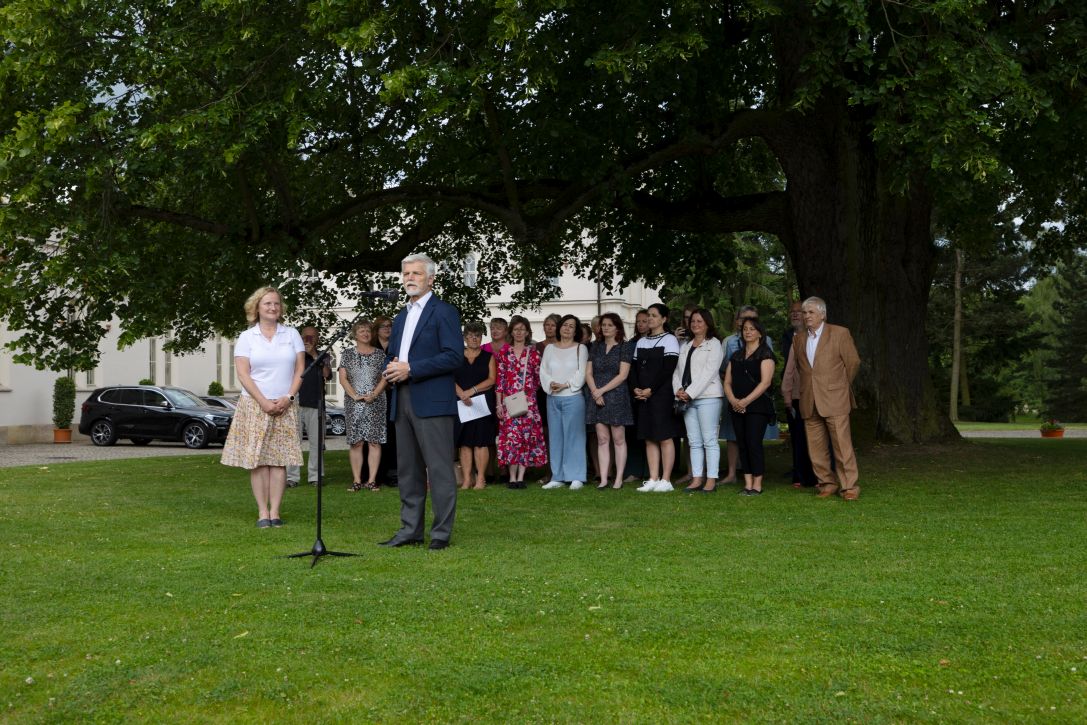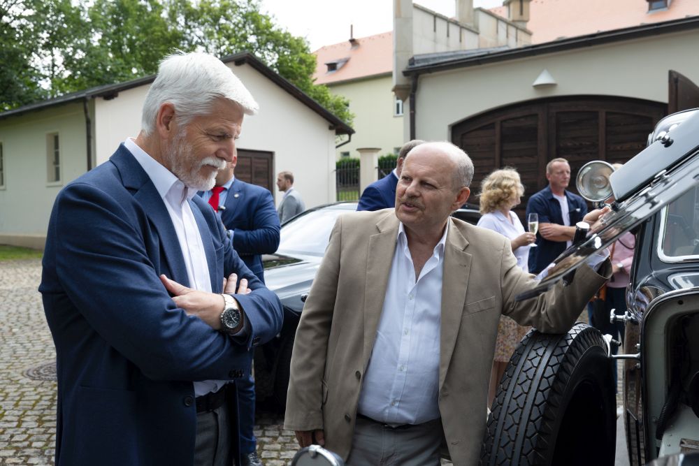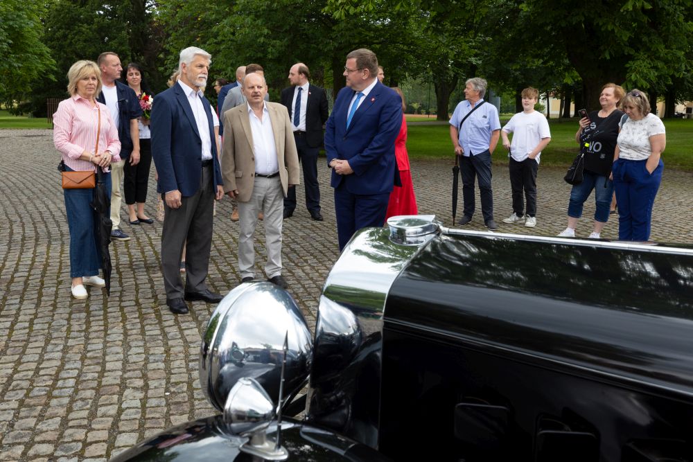 Prezident Petr Pavel s chotí Evou zahájil výstavu prezidentských automobilů ze sbírky Národního technického muzea na zámku v Lánech.
