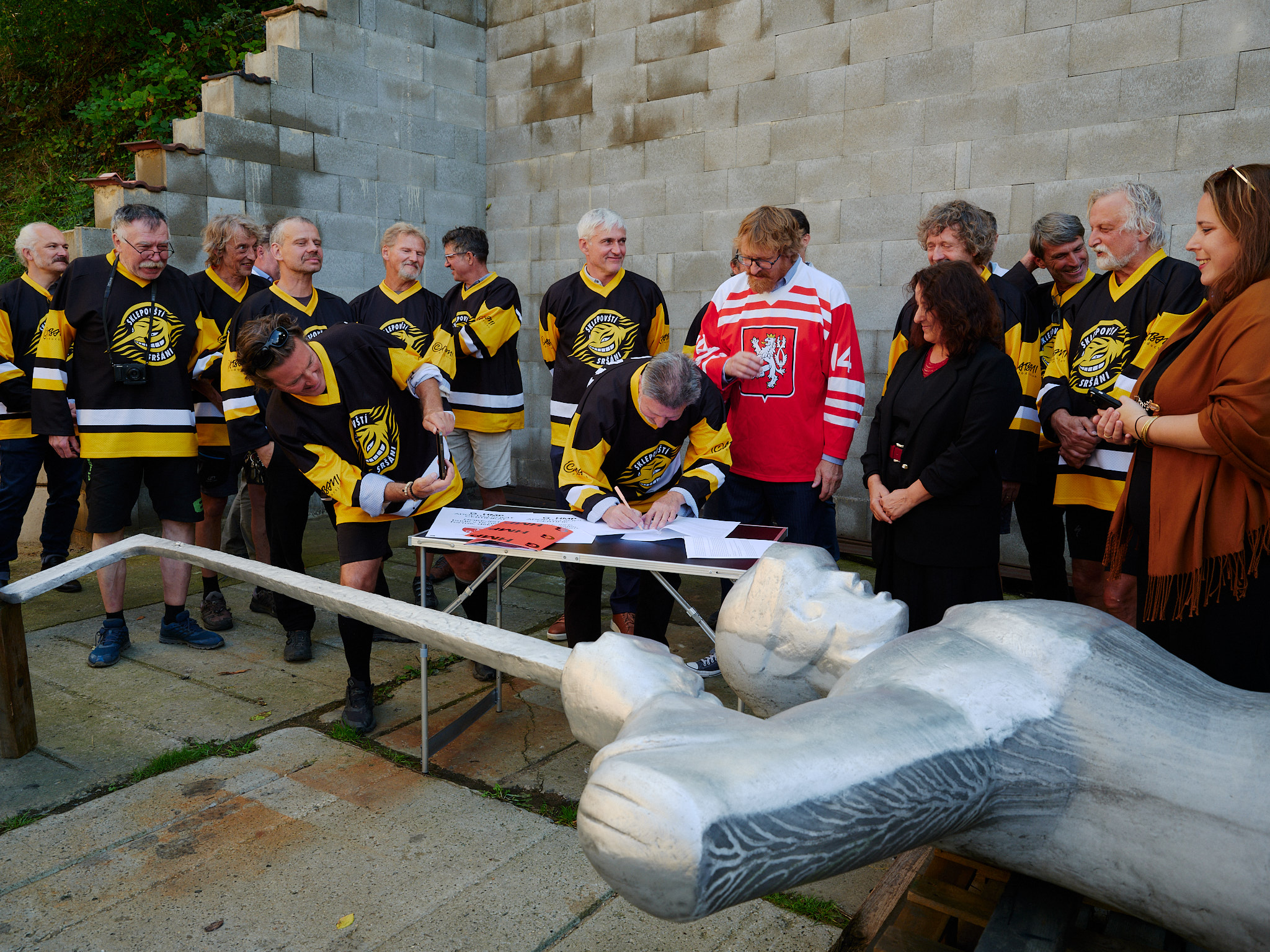 Projekt Adoptuj sochu: Slavní hokejisté z klubů Sklepovští sršáni a Čeští lvi přispěli na restaurování Hokejisty
