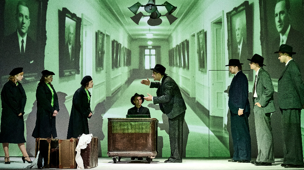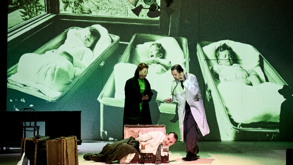 Hraje se na jednoduché, takřka pusté scéně ohraničen bílými stěnami s několika dveřmi.