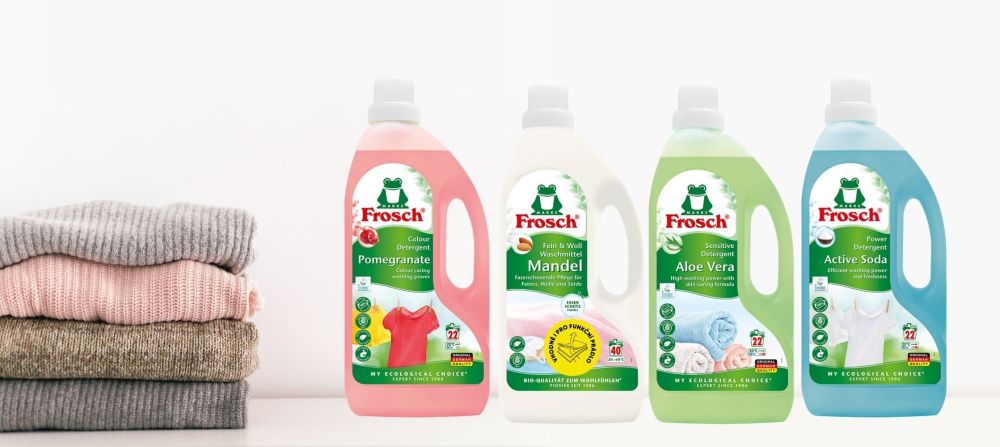 Frosch EKO Prací prostředky na bílé nebo barevné či určené pro citlivou pleť Ekologické prací gely značky Frosch na bázi přírodních látek odstraňují obvyklé nečistoty a zároveň pečují o prané textilie. Šetrné složení bez škodlivé chemie ošetřuje prádlo a je ohleduplné k pokožce. Prací gel s výtažky z aloe vera je díky extrémně šetrnému složení a velmi jemné parfemaci vhodný i pro citlivou pokožku. Gel s granátovým jablkem udržuje zase barvy i tvar oděvů. Velký důraz je kladen na samotný výrobní proces, který probíhá podle nejvyšších ekologických standardů s ohledem na co nejnižší spotřebu energie a na využívání přírodních obnovitelných zdrojů.