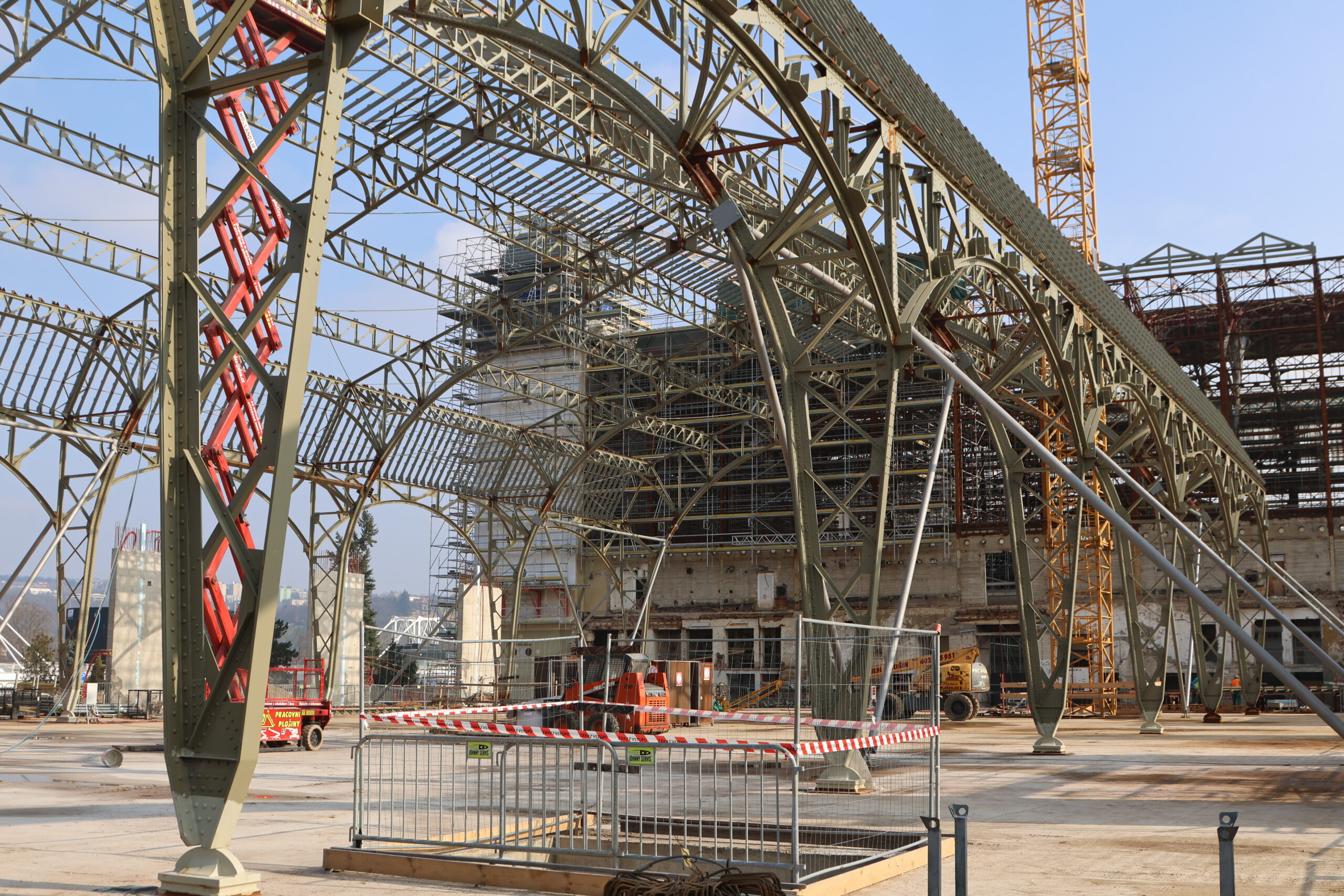 Obnova Průmyslového paláce na pražském Výstavišti pokračuje podle plánu i dva roky po zahájení náročných prací. Hotové už jsou například všechny výkopové práce, vznikl suterén pod levým křídlem paláce i s vjezdem pro kamiony a byla také vztyčena větší část ocelové konstrukce na levém křídle.