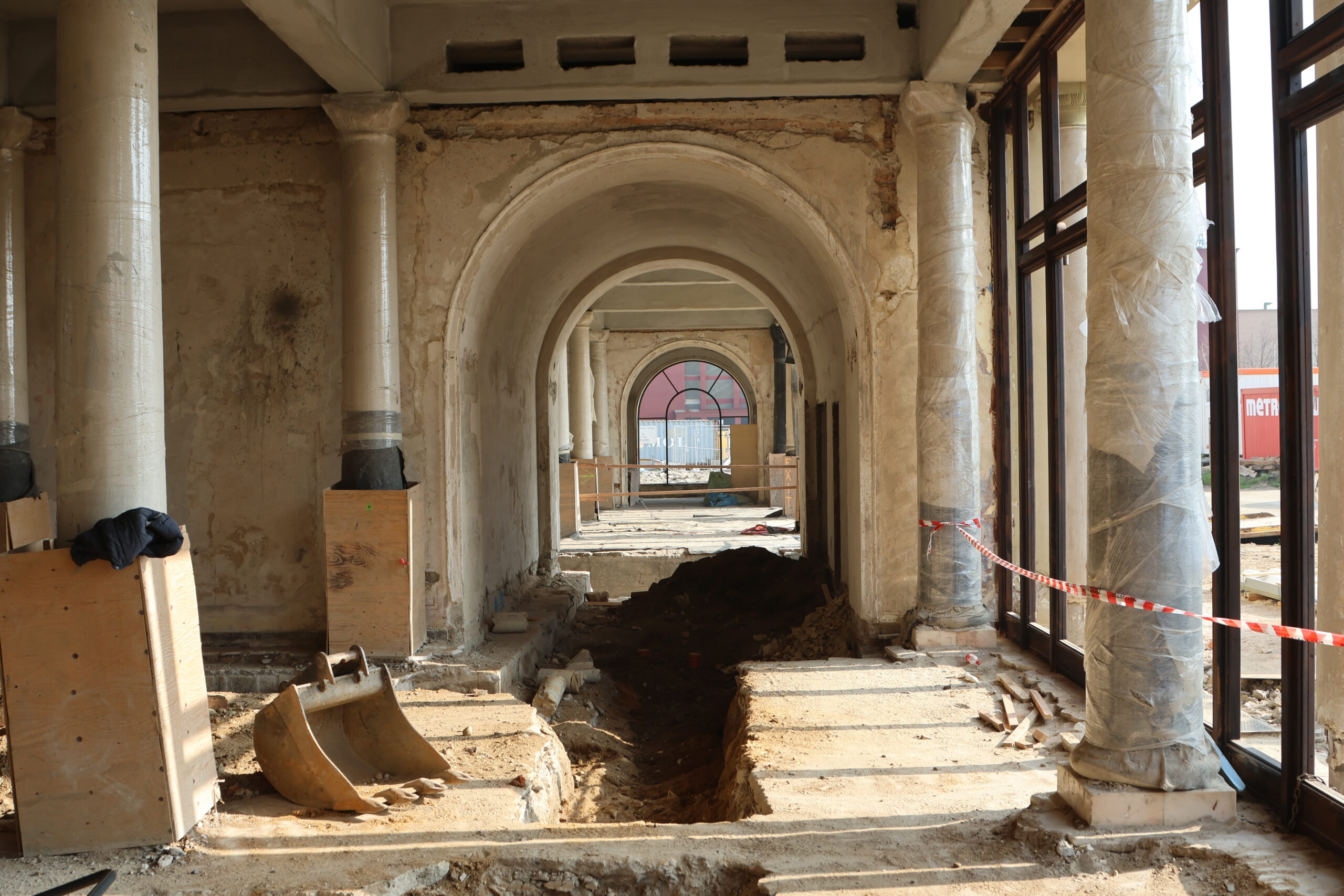 Ve střední hale už byly téměř všechny vitráže odinstalovány a renovovány, letos na jaře se začnou vracet zpět na své původní místo. Hotová je zde i větší část instalačních a technologických kanálů a zhruba ze tří čtvrtin je také rozebraný malovaný strop, který se v současnosti restauruje.