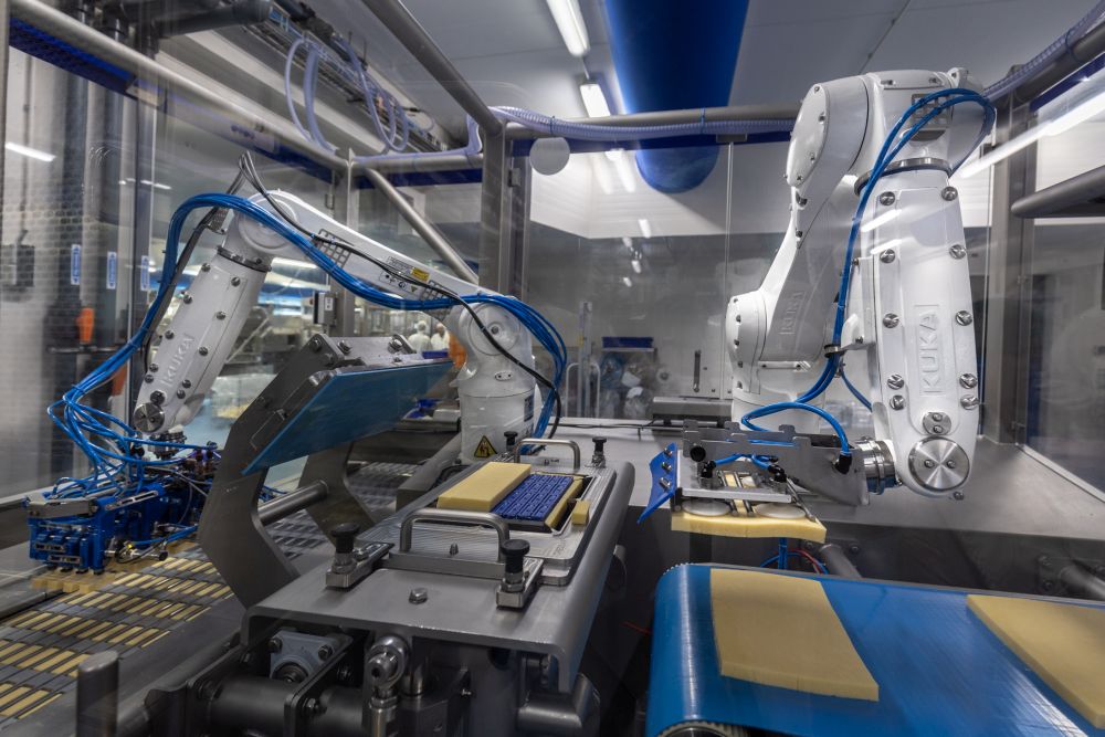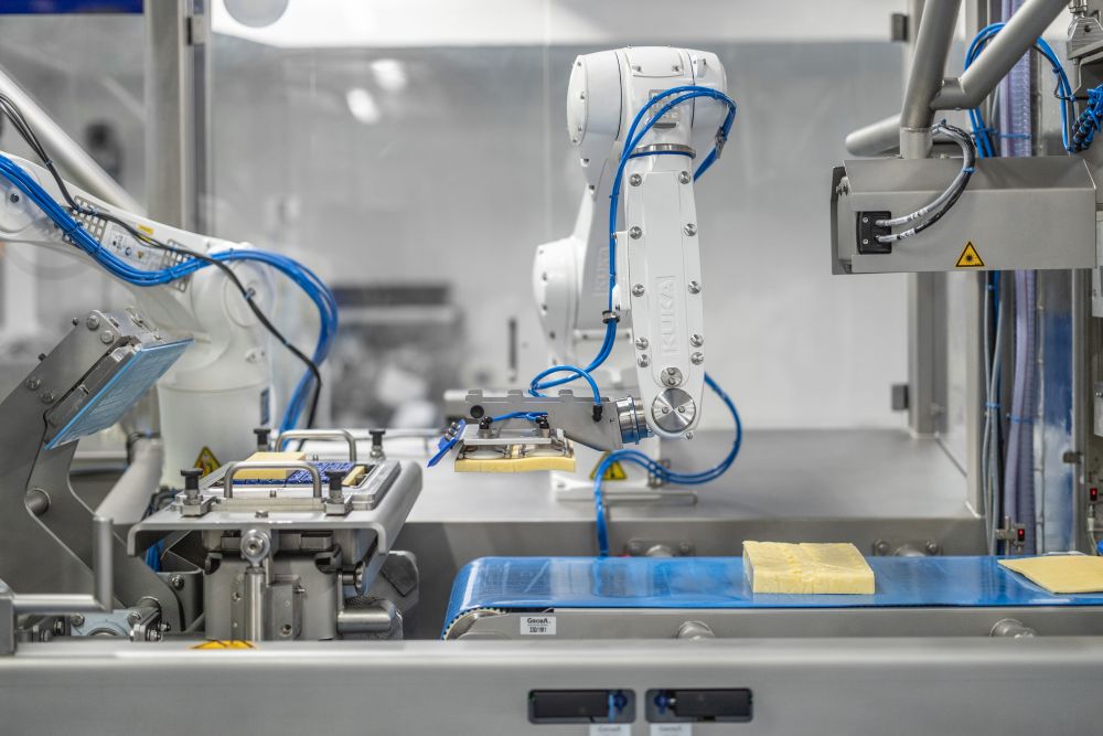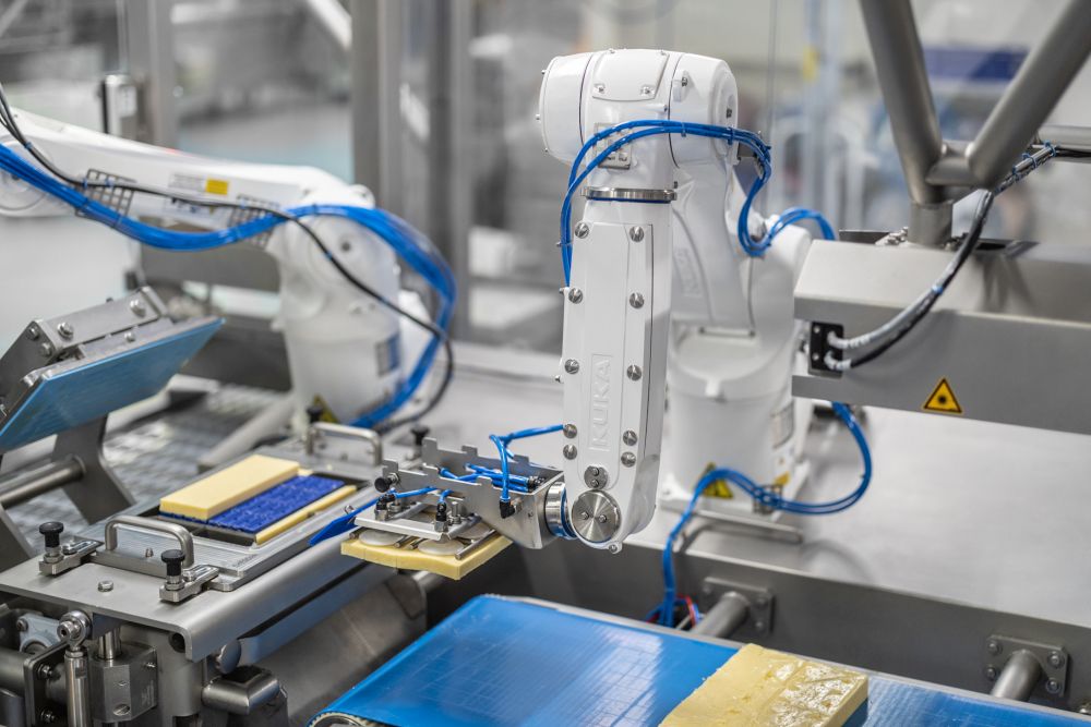 Holandská rodinná firma Vepo Cheese se spoléhá na plně automatizovanou výrobní linku: dva roboti KR AGILUS v hygienickém provedení od společnosti KUKA zpracovávají sýr do tvaru tyčinek a plní jimi balicí stroj. Díky tomu se společnosti podařilo zvýšit zdravotní standard a zdvojnásobit výrobní kapacitu.