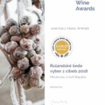 Ocenění: Zlatá medaile – Valtické vinné trhy 2019, Velká zlatá medaile – Grand prix vinex 2019, Stříbrná medaile – Terravino Izrael 2019, Velká zlatá medaile – Lednické vinné trhy 2020, Zlatá medaile – FESTWINE 2020, Velká zlatá medaile – Grand prix vinex 2020, Velká zlatá medaile – Král vín 2020, Velká zlatá medaile – Valtické vinné trhy 2020, Zlatá medaile – CM Štrasburk 2020, Zlatá medaile – Enoexpo Polsko 2020, Velká zlatá medaile – Galerie Rulandských vín 2021, Zlatá medaile – NSV Mikulovská 2021, Zlatá medaile – Vinař roku 2021, Zlatá medaile/vítěz kategorie – Salon vín ČR 2022, Zlatá medaile/Champion – Cool Climate Wine Awards 2022