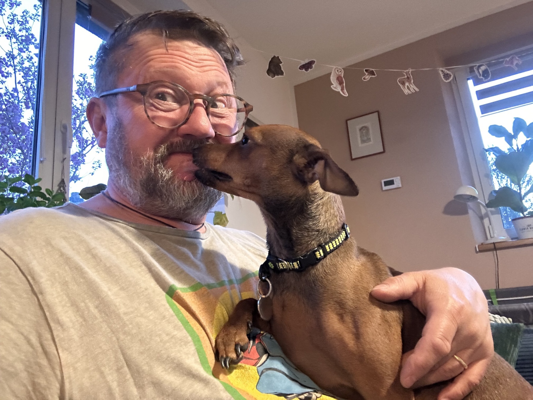 Karel Zima dorazí se svou stylovou slečnou voříškovou Růžou, kterou bezmezně miluje: „Růža je kříženec pinče a možná trošku chrta. Máme ji od adopťáčků úplně od štěňátka. Jsou jí tři roky. Nikdy jsem netoužil po malém pejskovi – naopak, měl jsem křížence boxera a vždy se mi líbily dogy. Ale náhoda tomu chtěla, že když jsme si šli prohlédnout dvouměsíční Růženku, bylo hotovo. Šli jsme s tím malým chundelatým míčkem na procházku. Byl květen, jako teď. Bylo krásně. A já si po cestě lehl na louku. Na břicho. Asi za dvě vteřiny už jsem ji měl na zádech. Seděla tam jako na rozhledně a tvářila se, že by to šlo. Tak jsme si ji vzali 😁. Adopce pejsků je jednoznačně bohulibá záležitost. Je jich tolik, co stojí o svého člověka, kterého pak budou milovat láskou bezmeznou.“ tak to mám i já., říká Karel Zima“
