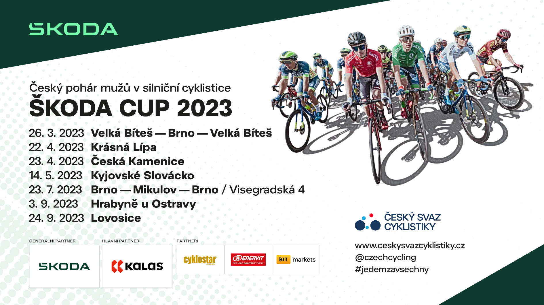 Český pohár v silniční cyklistice ŠKODA CUP bude mít v letošní sezoně sedm závodů, přičemž tři pořadatelé jsou úplně noví. Seriál začne tradiční klasikou Velká Bíteš-Brno-Velká Bíteš 26.3. a vyvrcholí finálovým kláním 24.9. v Lovosicích.