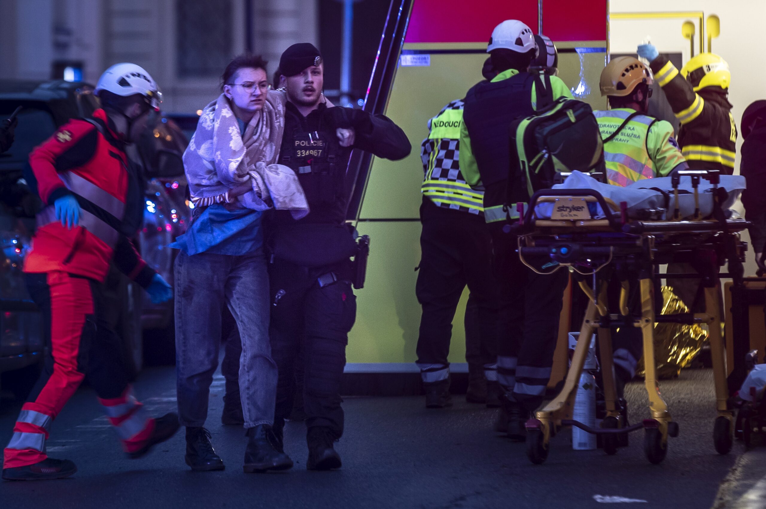 Střelba na filozofické fakultě Univerzity Karlovy na Palachově náměstí. Práce záchranných složek na odvedení studentů a učitelů do bezpečí. Zároveň péče o zraněné.