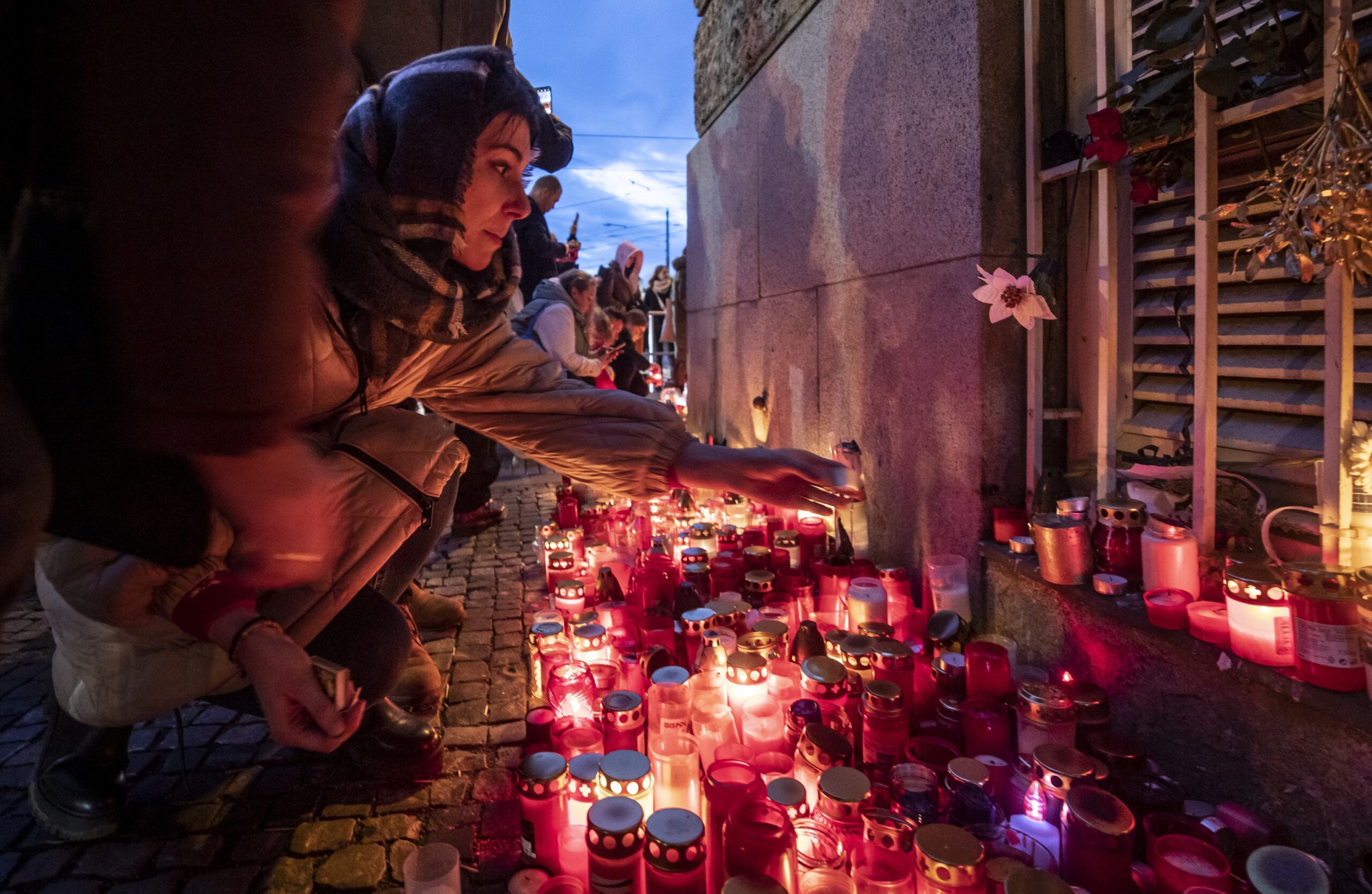 Pieta ze zesnulé po masové střelbě na filozofické fakultě před fakultou na Palachově náměstí.