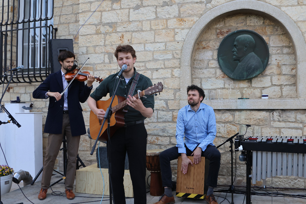 Vernisáž výstavy za krásného slunečného počasí s nezapomenutelným výhledem na Prahu doprovázela hudba. Herec Studia Ypsilon Jan Bradáč přispěl k pohodě se svým swingovým triem Swio.