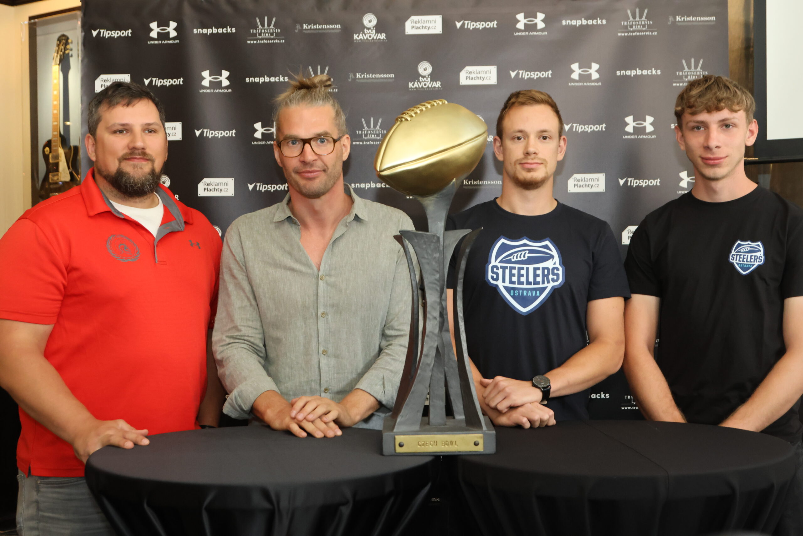 Zleva Matěj Večes Hlavní trenér, Jan Dundáček Quarterback Vysočina Gladiators Jan Telnar Cornerback, ISMM Ostrava Steelers Amos Feranec Quarterback ISMM Ostrava Steelers