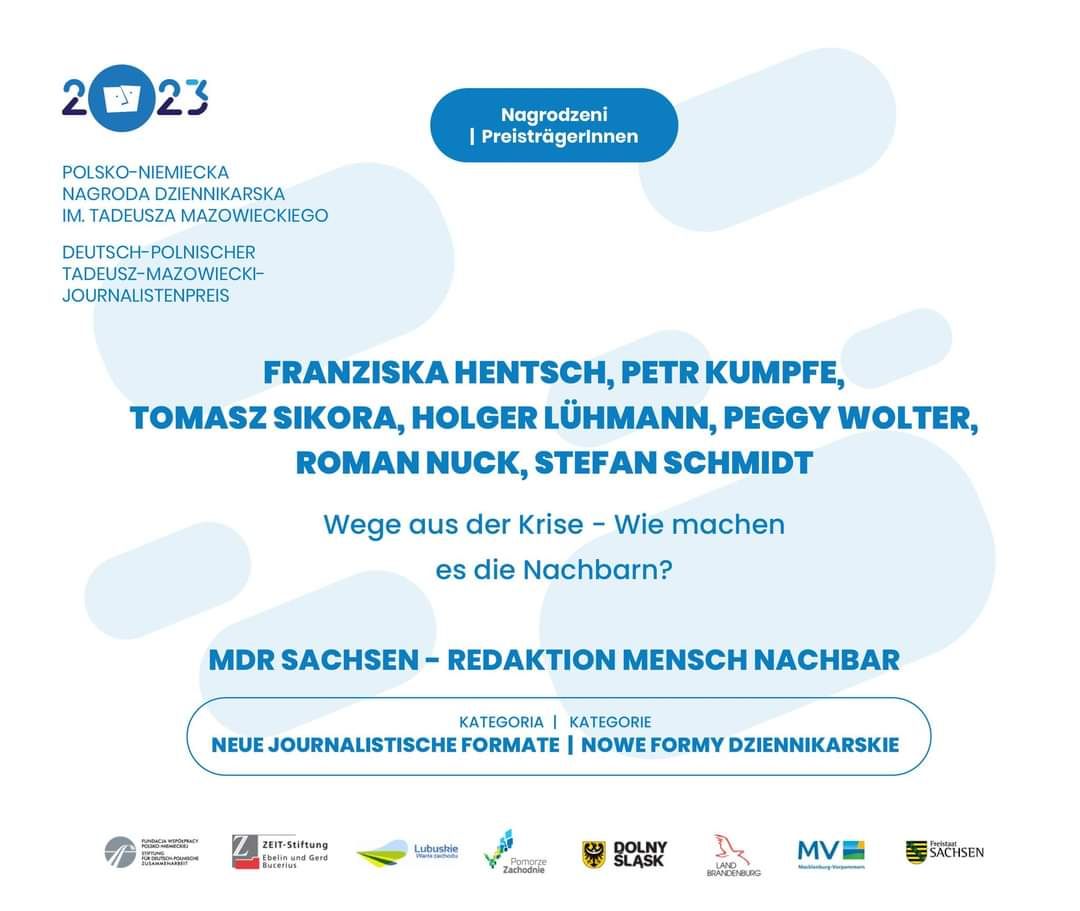 Moderátor, novinář a tlumočník Petr Kumpfe z Liberce, kterého si možná pamatujete z celé řady společenských akcí, byl včera večer v Lubuském divadle v Zelené Hoře v Polsku vyznamenán polsko-německou Novinářskou cenou Tadeusze Mazowieckého za rozhlasový pořad, vysílaný každou neděli od 18:00 na německé rozhlasové stanici MDR Sachsen. Pořad shrnuje nejdůležitější a nejzajímavější událostí uplynulého týdne v Polsku a Česku, a to neotřelým a neformálním způsobem. „Cena mne velmi potěšila. Zásluhu však na ní má celý tým, který pořad připravuje. Především je to Roman Nuck z německého studia rozhlasu MDR a Tomasz Sikora z polského rozhlasu Radio Wroclaw,“ říká oceněný moderátor. „Dík samozřejmě patří i všem z libereckého studia Českého rozhlasu, v jejichž studiu každý týden česká část pořadu vzniká.“ Dále Kumpfe doplňuje: „Je bezesporu zajímavé, že jsme byli nominováni nikoliv v kategorii rozhlas, ale v kategorii nová média, protože náš pořad existuje samozřejmě také jako podcast. A konkrétní díl, který porotu zaujal, navíc přidává i televizní reportáže. Věnovali jsme se energetické krizi, alternativním zdrojům, ale třeba i tomu jaký je všení život za volantem elektroauta. Kombinace tří médií i tří zemí nám přinesla úspěch.“ Dodává oceněný moderátor.