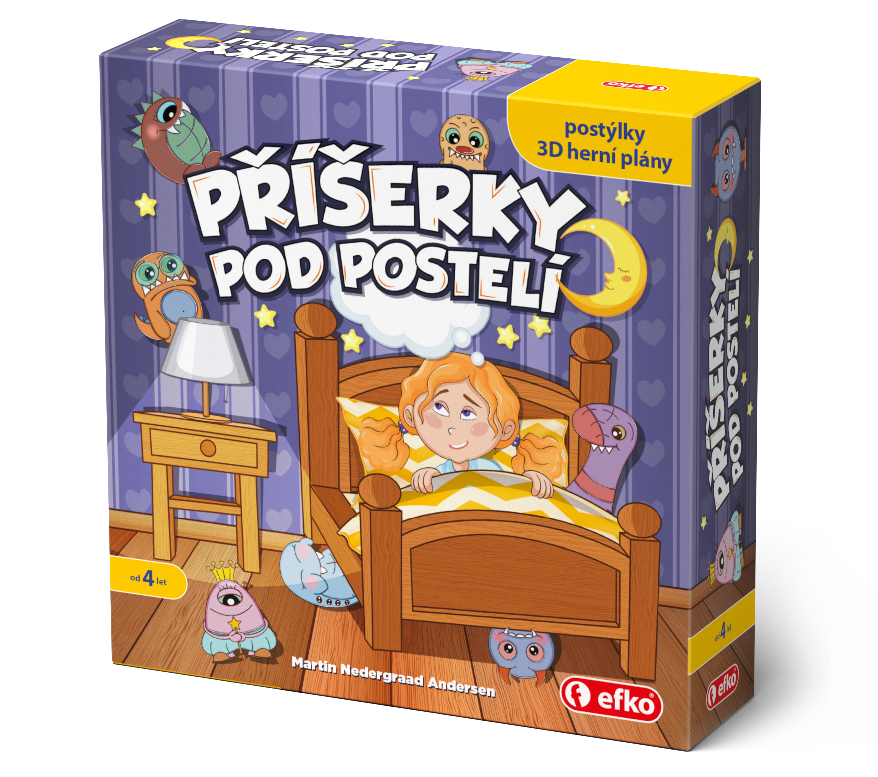 Tuto novou milou paměťovou hru pro všechny strašpytlíky i nebojsy vytvořila firma EFKO ve spolupráci s celosvětově úspěšným dánským autorem her Martinem N. Andersenem. Úkolem všech hráčů je najít pod 3D postýlkami co nejvíce dvojic neposedných příšerek. Když se jim povede příšerky pochytat do půlnoci, mohou jít všichni v klidu spát. Děti i dospělí potrénují paměť, trpělivost i jemnou motoriku. Hra je určena pro 2-4 hráče, má jednoduchá pravidla a je vhodná pro všechny od 4 let. MOC 379 Kč.
