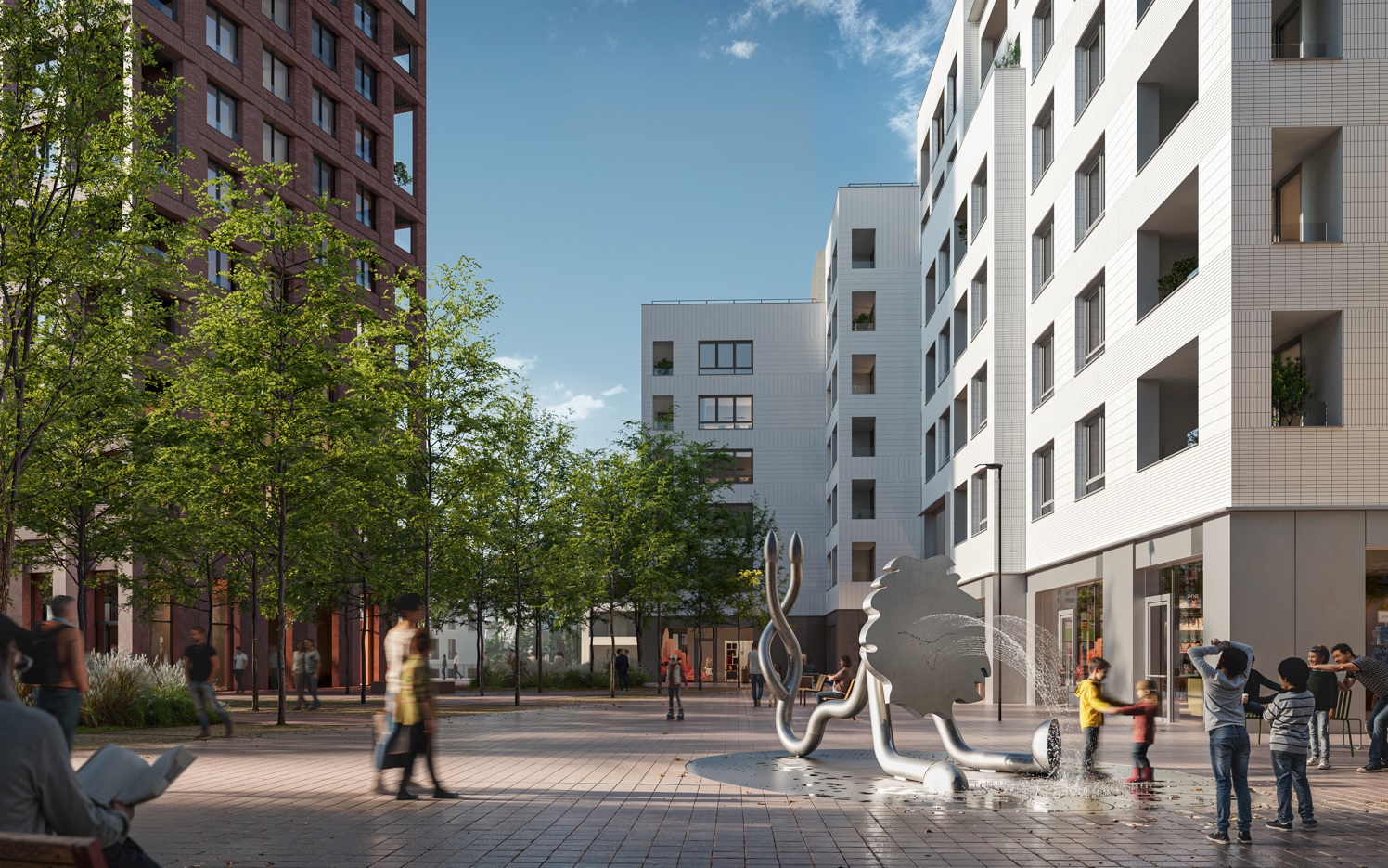Veřejné prostranství odráží nejnovější trendy v přístupu k práci s okolní krajinou od Ferdinanda Lefflera ze studia Flera a zakládá se na konceptu modrozelené infrastruktury. Bohatě osazená zeleň zajistí kvalitní mikroklima i přirozené stínění v letních dnech. Dešťová voda bude shromažďována v akumulačních nádržích pro zavlažování zelených ploch, s přebytkem odváděným do Vltavy. Obyvatelé také efektivně využijí recyklovanou tzv. šedou vodu, se kterou mohou vedle splachování toalet také prát prádlo v automatických pračkách. Díky řadě hospodárných opatření, včetně úsporných armatur, se v projektu počítá s úsporou pitné vody o 53 %, což představuje 59 litrů vody na obyvatele za den.