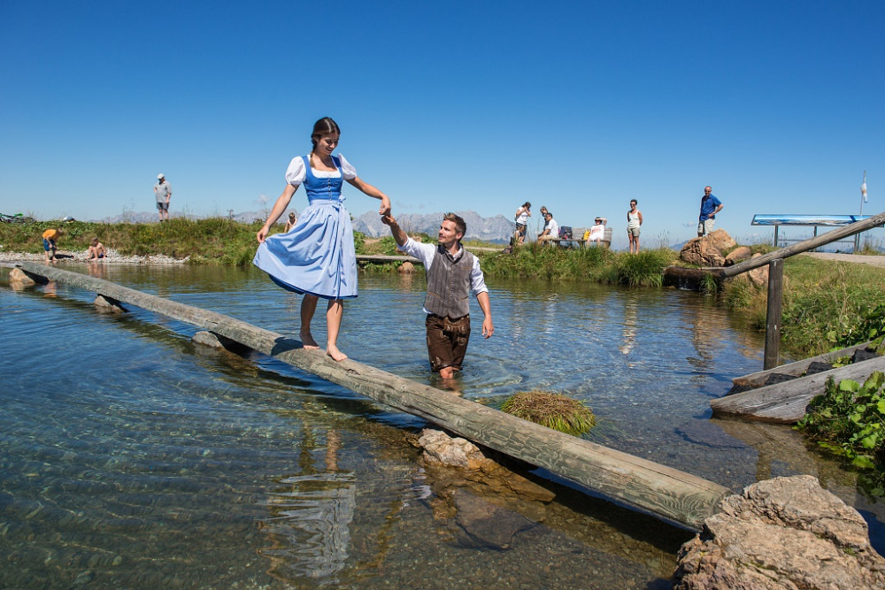 Stezky Jsou rovněž připraveny tři nové stezky v této oblasti. Je zde vybudováno sedm nádrží na vodu pro zasněžování lyžařských svahů. Nádrže se budou využívat i v létě. Podél čtyř nádrží – jezer kolem celého hřebenu Hahnenkamm vede nová stezka. Návštěvníci se tu mohou v létě vykoupat, jsou tu dokonce i plavčíci. Přestože to je v horách dosahuje teplota vody v horkém létě kolem 200 C.V listopadu je voda v nádržích příliš teplá na zasněžování (15 °C) U nádrží jsou proto chladící věže, které vodu zchladí na 3-4 °C. Další stezka vede krasovou oblastí ke Kitzbühel Hornu. Podél této trasy byly nalezeny fosilie z doby alpského vrásnění před miliony lety. Třetí trasa vede na horské pastviny. Zde můžete osvěžit unavené nohy v Kneippově chodníčku. Vodoléčebná relaxační procedura je založena na principu střídání teplé a studené vody. ,,Zázračné” účinky vody objevil v 19. století německý kněz Sebastian Kneipp. Střídavě se přešlapuje v teplé a studené vodě. Teplá voda dosahuje teploty 40 °C a studená má okolo 10–12 °.