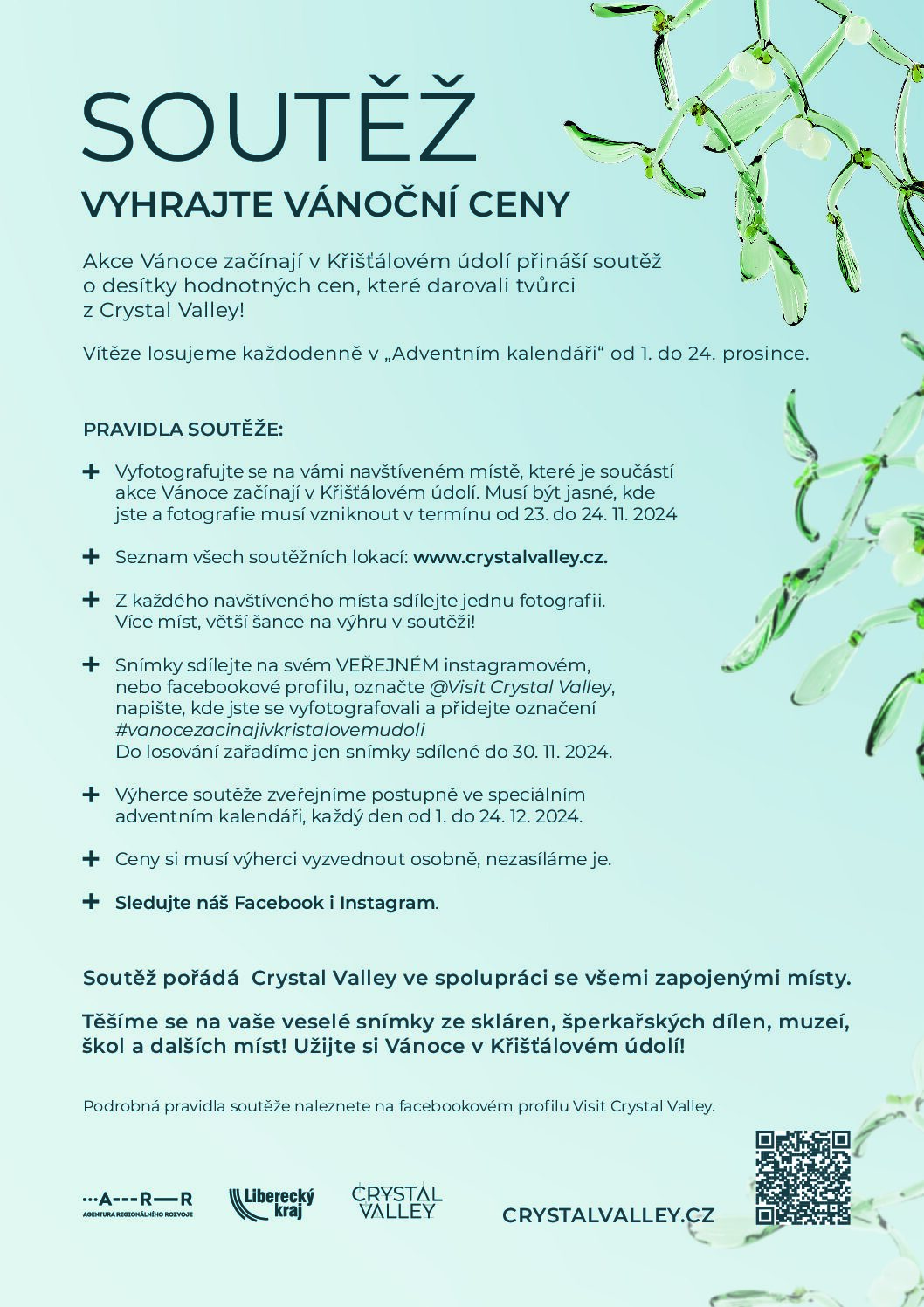 Zařazeni do losování o hodnotné ceny budou ti, kdo se na navštívených místech vyfotografují a nasdílí snímky s hashtagem #vanocezacinajivkristalovemudoli a označením @Visit Crystal Valley na veřejném facebookovém, nebo instagramovém profilu. Šťastní výherci se najdou ve speciálním „Adventním kalendáři“ na facebookovém profilu Visit Crystal Valley, každodenně od 1.-24. prosince.