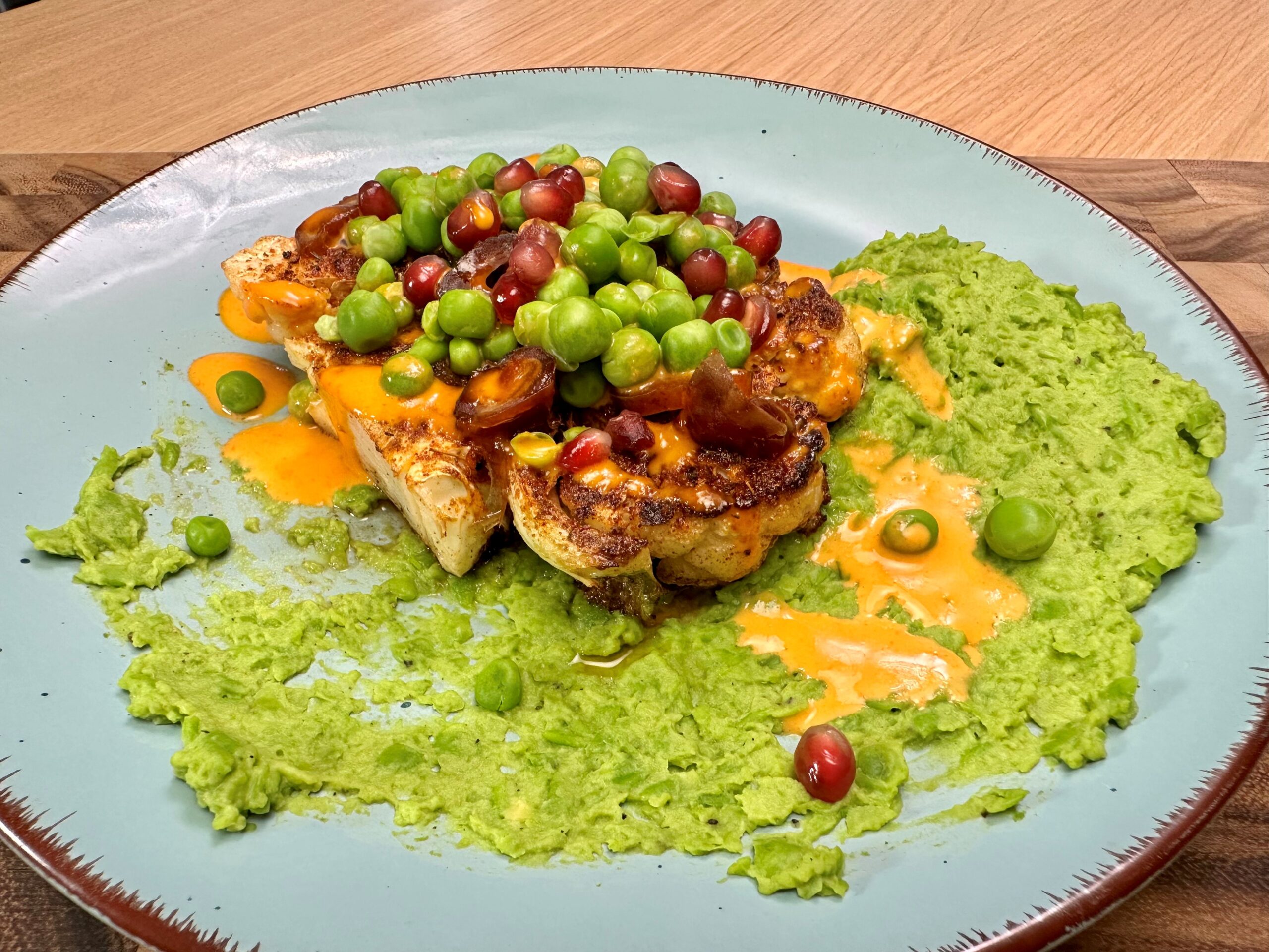 Nakonec servírujeme – na talíř dáme připravenou hráškovou kaši, steak, hrášek, který jsme si nechali stranou, granátové jablko, sušené datle a vegetariánskou shiraza majonézu.