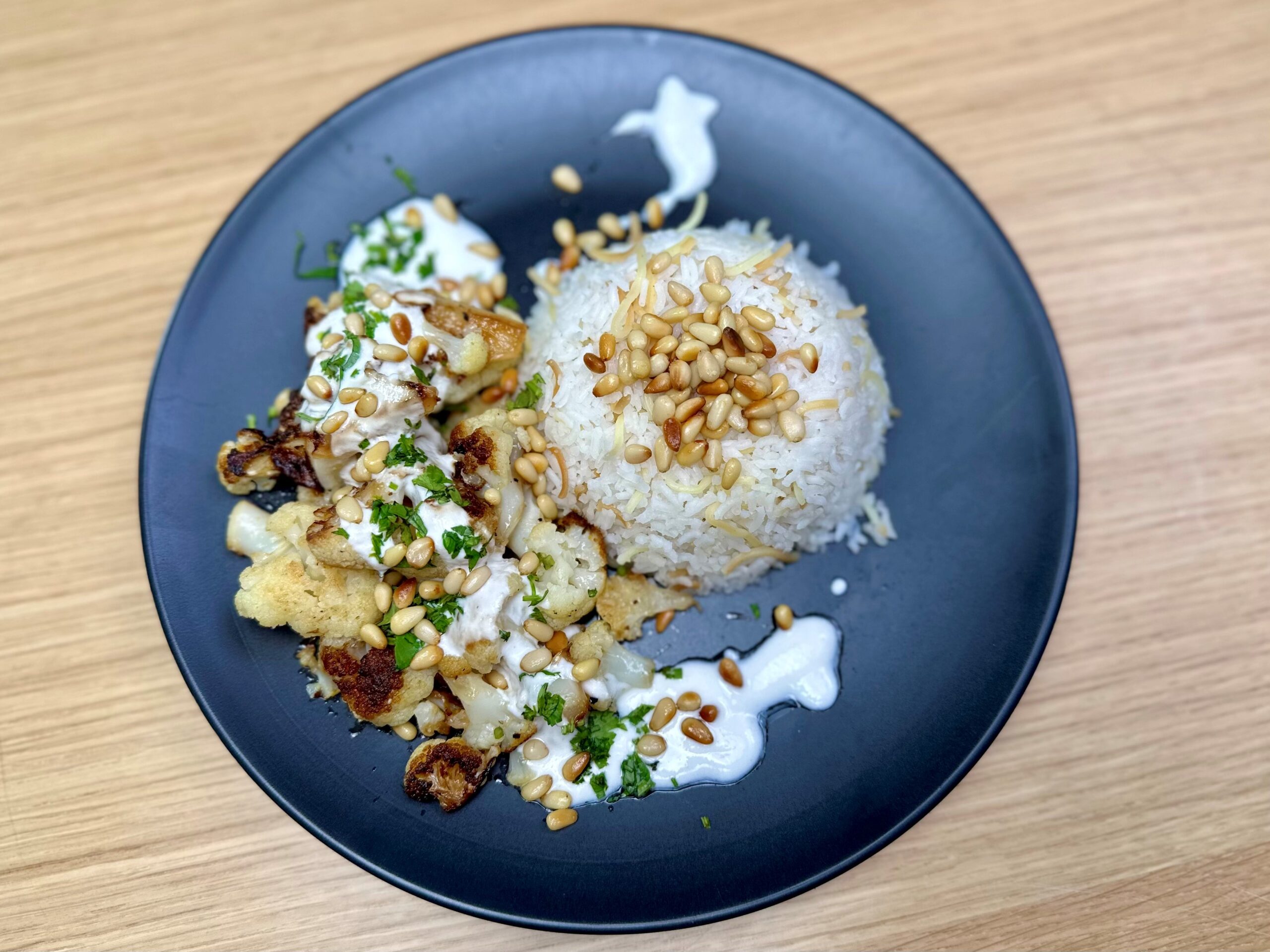 Na talíř nandáme rýži a květák, zalijeme omáčkou a na závěr posypeme bylinkami a piniovými oříšky.