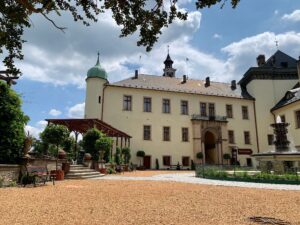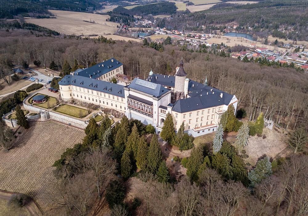 Zámek vznikl z hradu, který byl založen Břetislavem ze Zbirohu z rodu Sulislavců před rokem 1230. Protože jej vlastnili tři císařové Karel IV., Zikmund a Rudolf II je nazýván „zámek tří císařů“. Podnikatel baron Strousberg zámek v letech 1869 až 1870 přestavěl do novorenesanční podoby. V roce 1879 po Strousbergově bankrotu zámek koupili Colloredo-Mansfeldové. Nyní zámek vlastní Jaroslav Pácha.V monumentálním Muchově sále Alfons Mucha, namaloval své nejznámější dílo “Slovanskou epopej”.