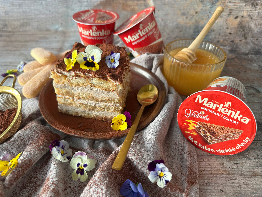 Smetanový jogurt z Valašska MARLENKA med, kakao, vlašské ořechy v kombinaci s mascarpone, voňavým espressem a piškoty. Klasické italské tiramisu v novém, ještě lahodnějším kabátě! Stačí 30 minut přípravy, přes noc necháte v lednici a výsledek je naprosto božský.