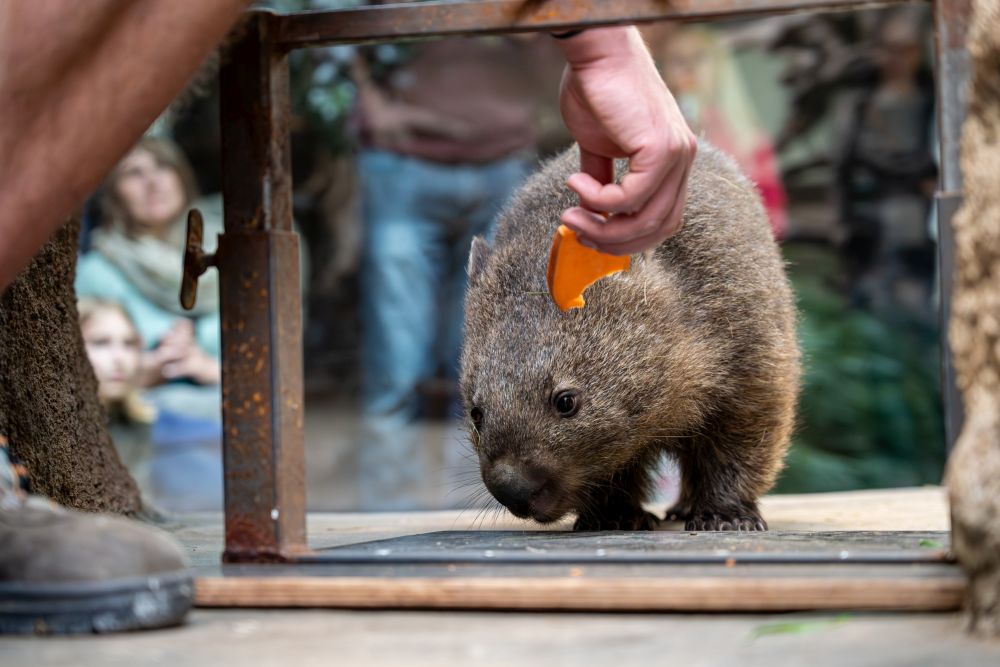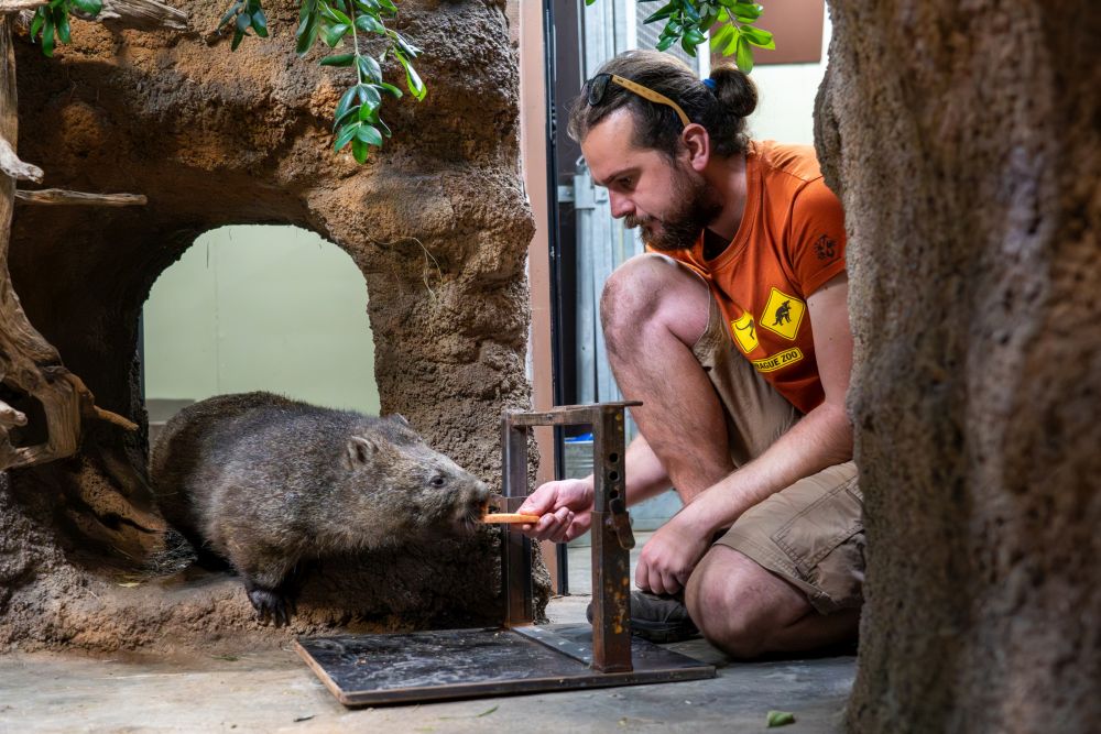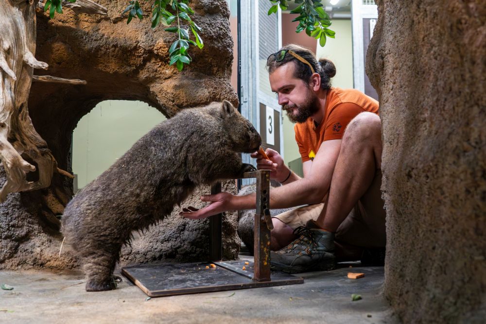 Foto 2: Batáty patří k nejoblíbenějším složkám jídelníčku vombatů v pražské zoo. Právě na tuto pochoutku láká chovatel David Vala samici Winkleigh k veterinárnímu tréninku. Foto Oliver Le Que, Zoo Praha