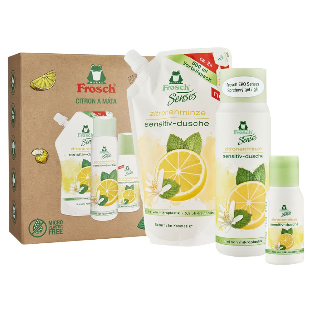 o bsahuje Sprchový gel, náhradní náplň a cestovní balení sprchového gelu. Nabuďte se svěží vůní citronu a máty a užijte si sprchování s péčí přírodního sprchového gelu, který je šetrný k vaší pokožce. Získejte krásně jemnou a hebkou pokožku díky péči během každé sprchy. Řada sprchových gelů Frosch Senses má šetrnou recepturu na bázi přírodních látek s neutrálním pH 5,5. Dermatologické testy potvrzují výbornou snášenlivost sprchového gelu i u citlivé pokožky. Cena výrobku je 199 Kč.